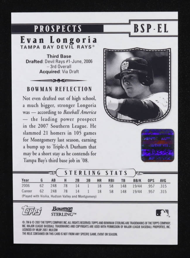Evan Longoria 2007 Bowman Sterling Prospects #EL Jersey Autograph