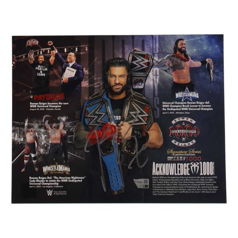 Photo measures 11" x 14" in size and has been hand-signed by Roman Reigns. The photo is limited edition and has been numbered #247/1000. Please note, there are creases throughout the photo.