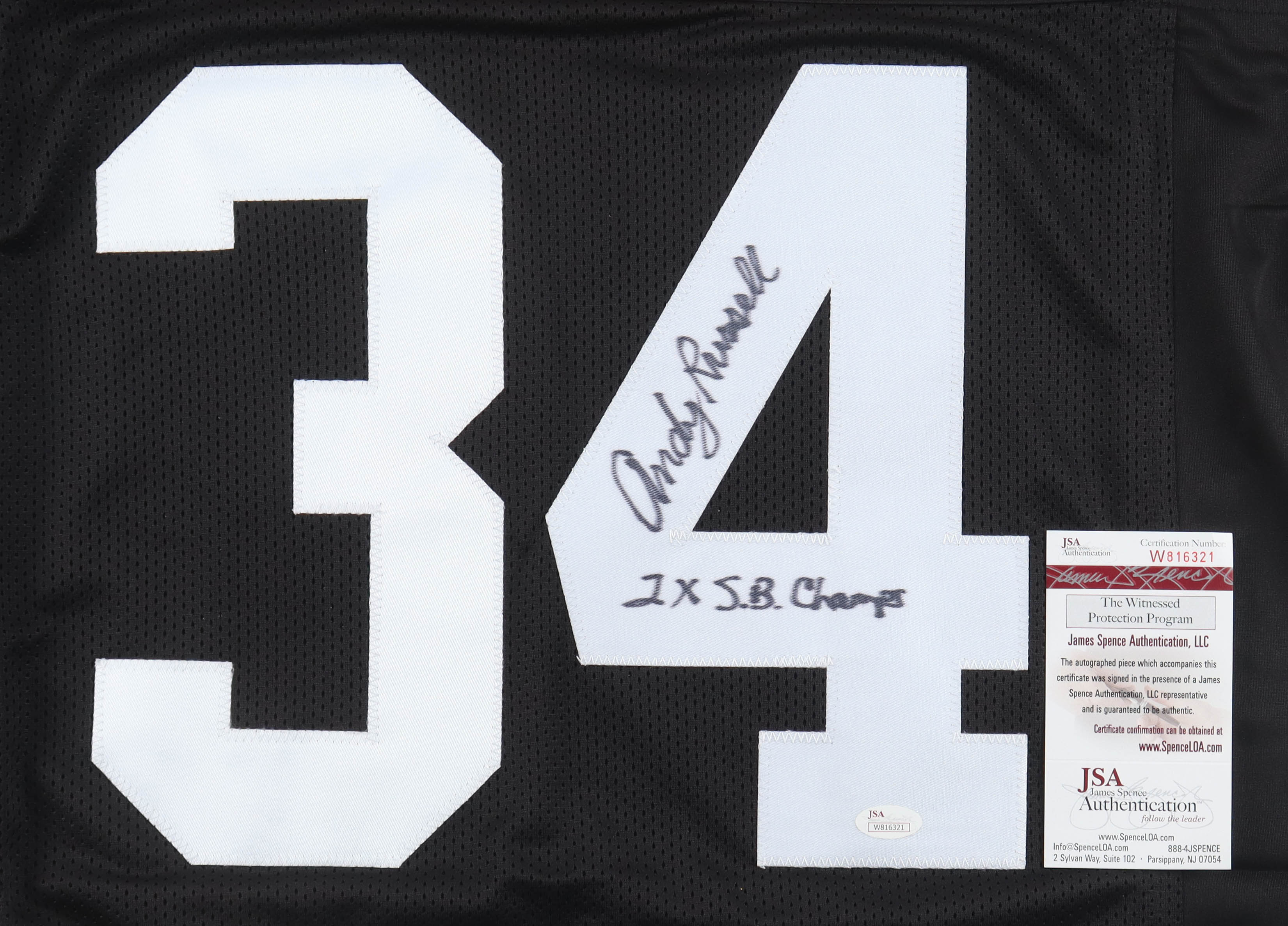 Custom jersey. Everything is sewn on, size XL. Hand-signed and inscribed by Andy Russell (D. 2024). Russell's career highlights have been custom stitched onto the back of the jersey below the reverse numbers. The jersey is limited edition and is one of 34.