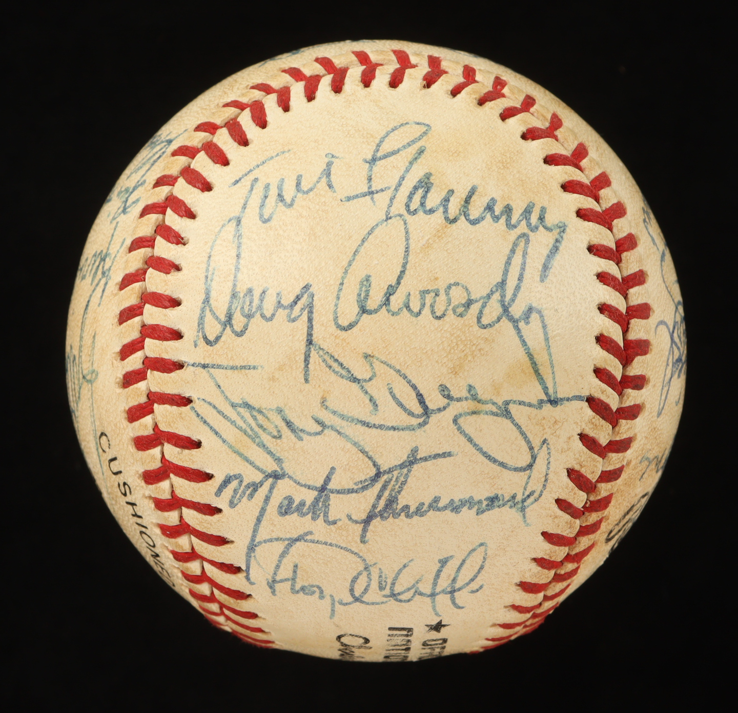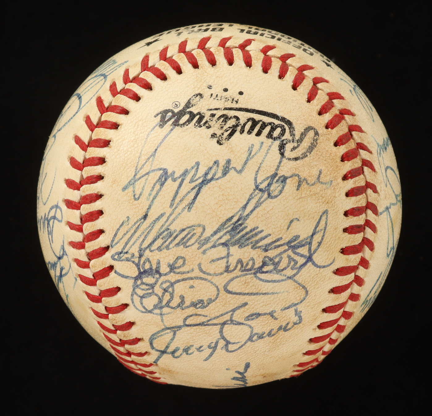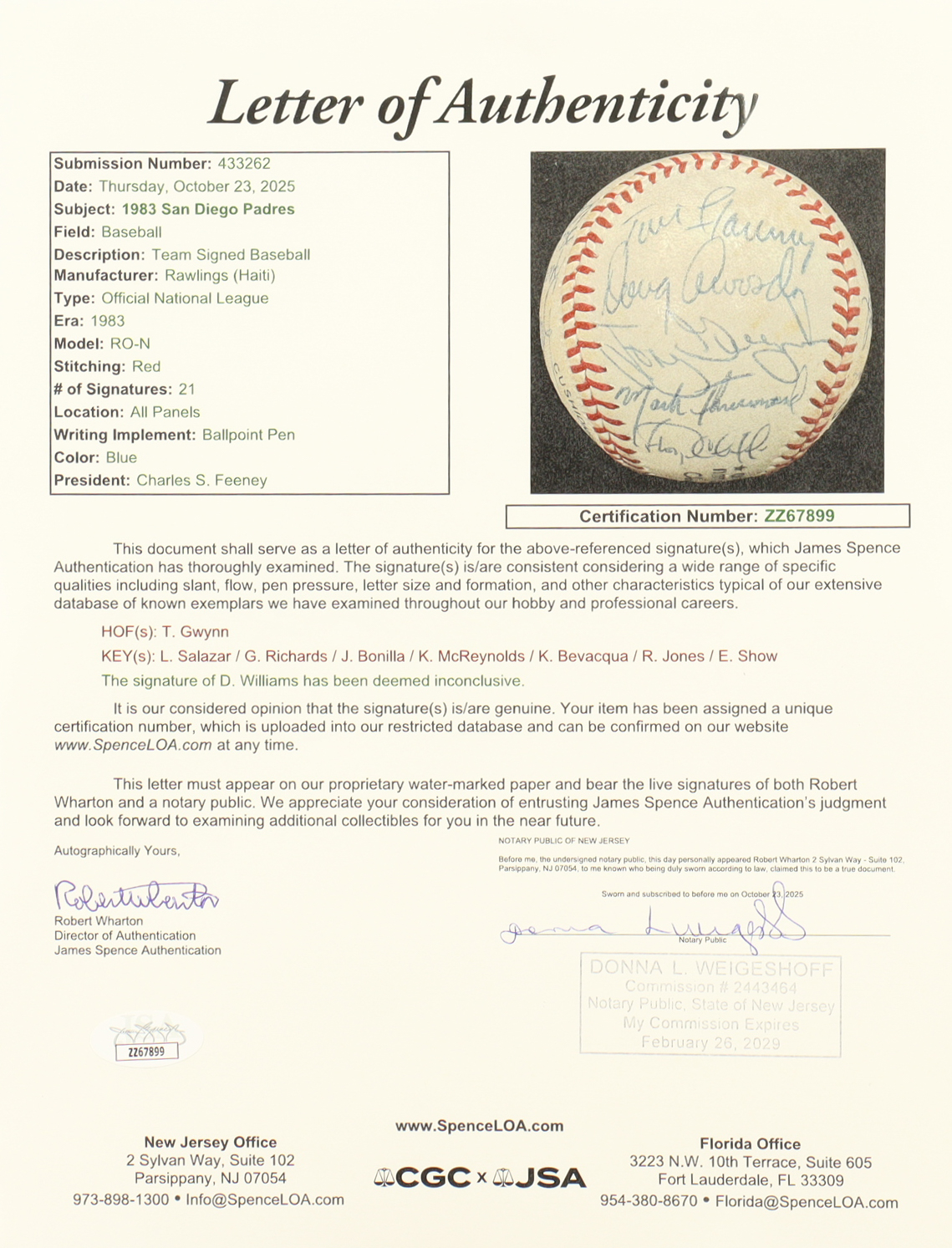 Official National League Baseball. Team-signed by (21) 1983 San Diego Padres including Tony Gwynn, Luis Salazar, Gene Richards, Juan Bonilla, Kevin McReynolds, Kurt Bevacqua, Ruppert Jones, Eric Show and (13) others. Please note, the baseball is naturally toned, the some signatures are fading and the Dick Williams signature has been deemed inconclusive.