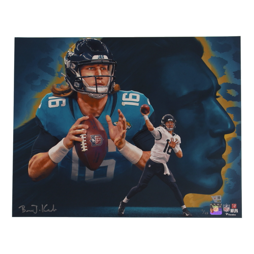 Photo of Trevor Lawrence (Jacksonville Jaguars) measures 16” x 20” in size and has been hand-signed by Brian Konnick (Artist). This photo is limited edition and has been hand-numbered #9/25. Please note, there are creases throughout the photo.