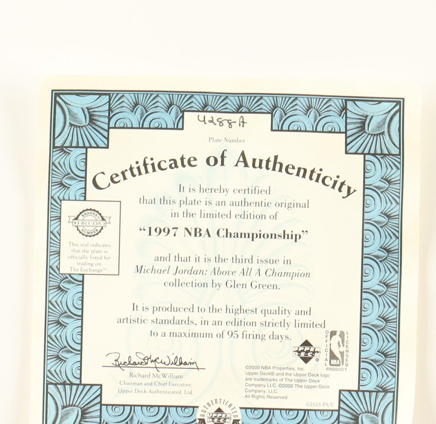Plate measures approximately 8.5" in diameter and features Glen Green's "1997 NBA Championship", third issue in the "Michael Jordan: Above All a Champion" collection. (Chicago Bulls, HOF). Please see photos for details regarding the condition of the plate. Please note, the signature is a facsimile.