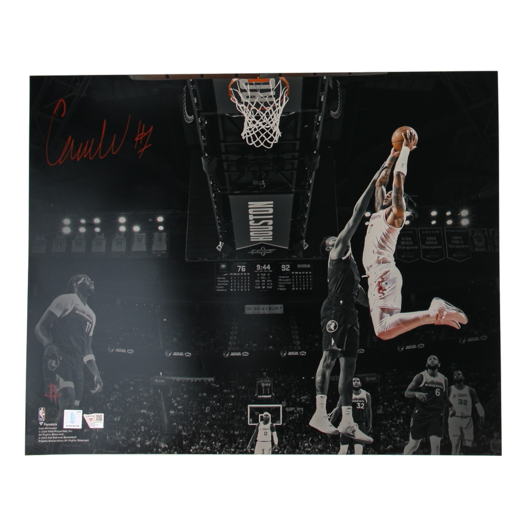 Photo measures 16" x 20" in size and has been hand-signed by Cam Whitmore (Houston Rockets). Please note, the signature has been smudged and there are creases throughout the photo.