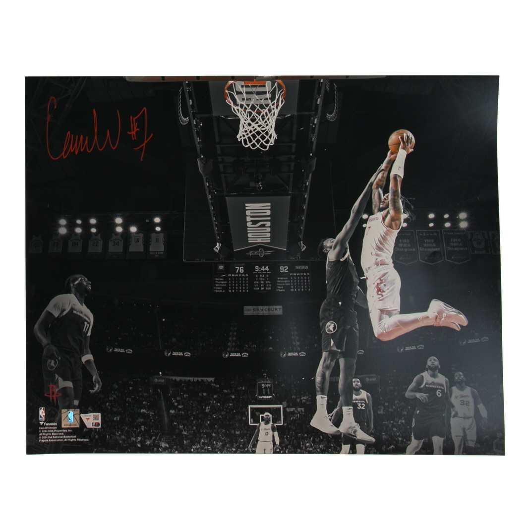 Photo measures 16" x 20" in size and has been hand-signed by Cam Whitmore (Houston Rockets). Please note, the signature has been smudged and there are creases throughout the photo.