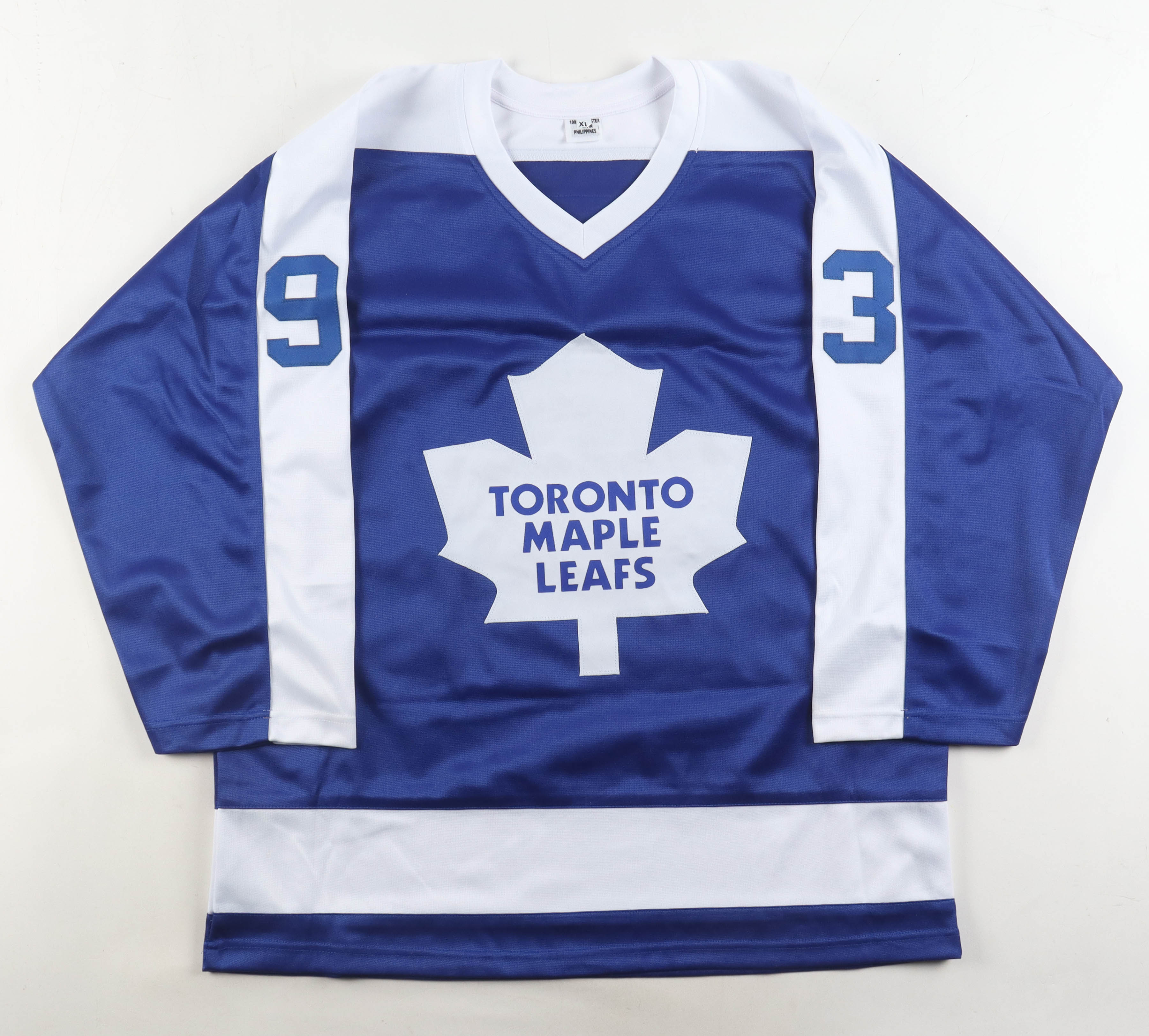 Custom jersey with everything sewn on, size XL. Hand-signed and inscribed by Doug Gilmour (HOF).