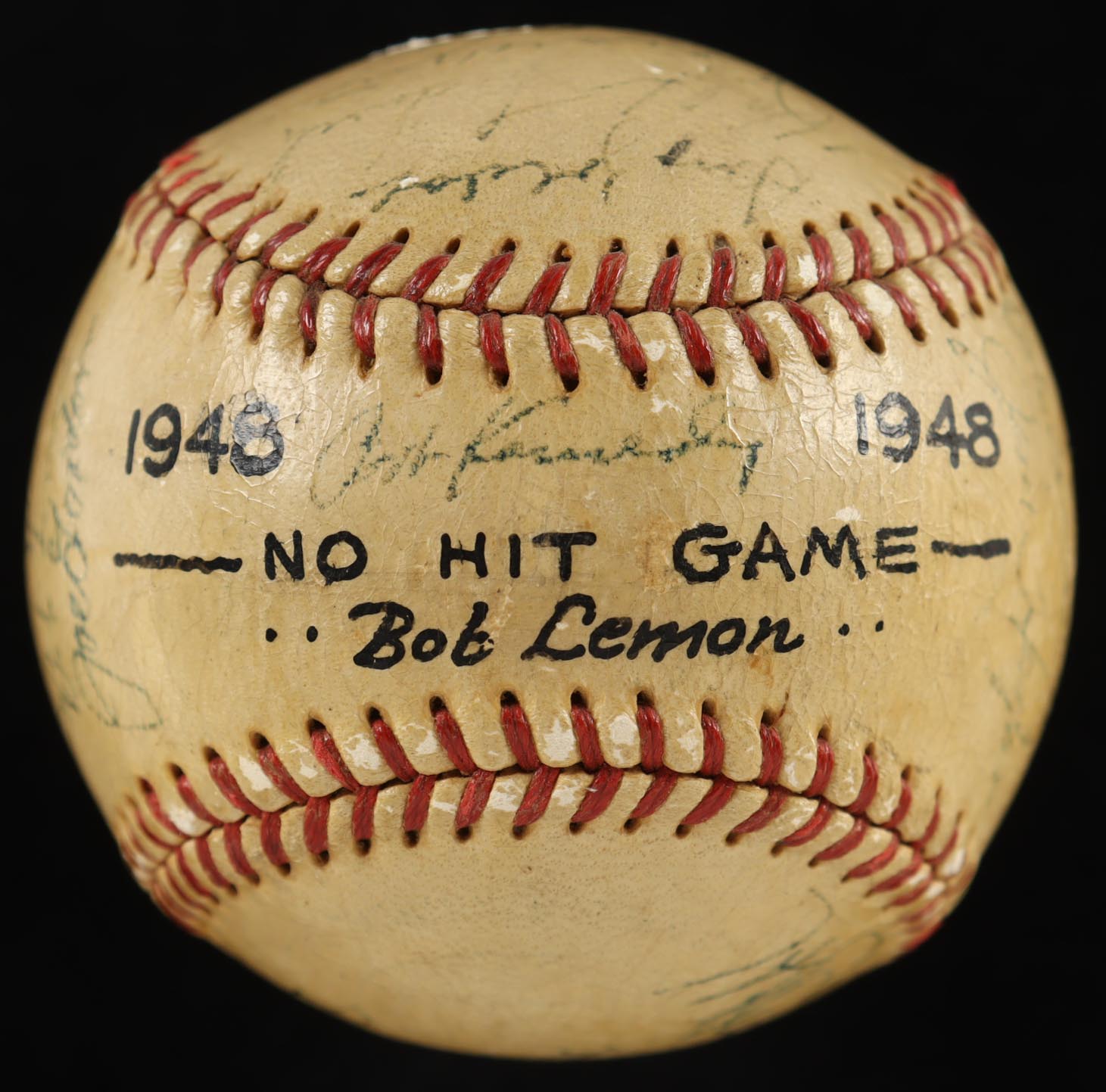1948 Bob Lemon "No Hit Game" baseball has been hand-signed by (27) members of the 1948 Cleveland Indians, including: