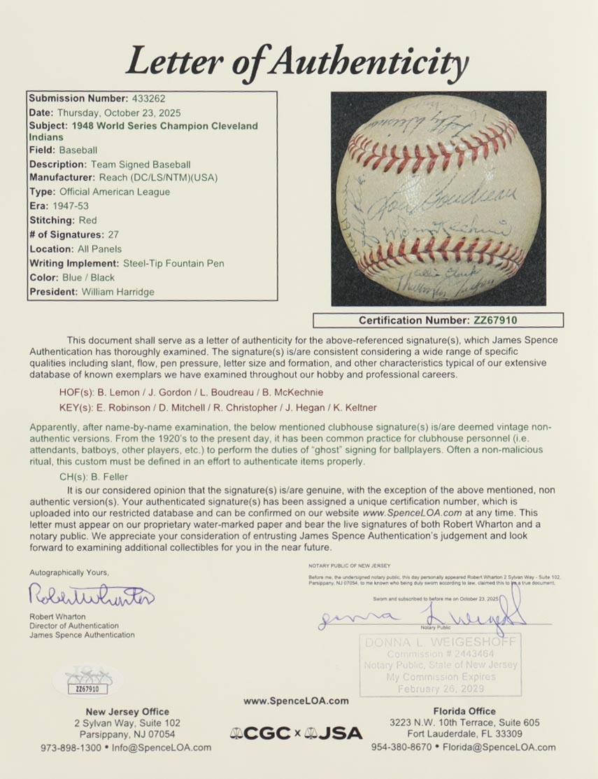 1948 World Series Champions Baseball Signed By (27) with Eddie Robinson, Dale Mitchell, Russ Christopher, Jim Hegan (JSA)