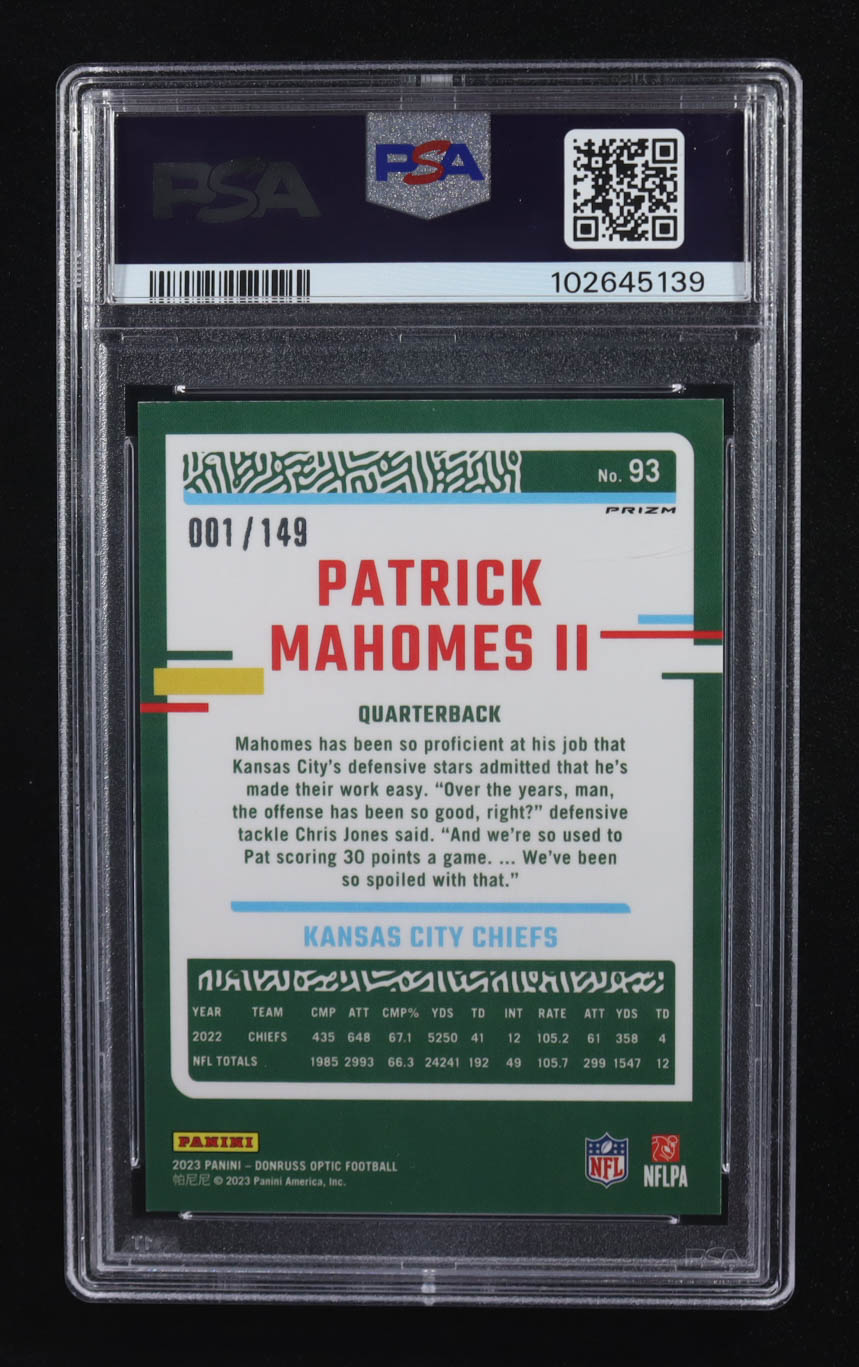 Patrick Mahomes II 2023 Donruss Optic Flex Prizm #93 #001/149 (PSA 9)
