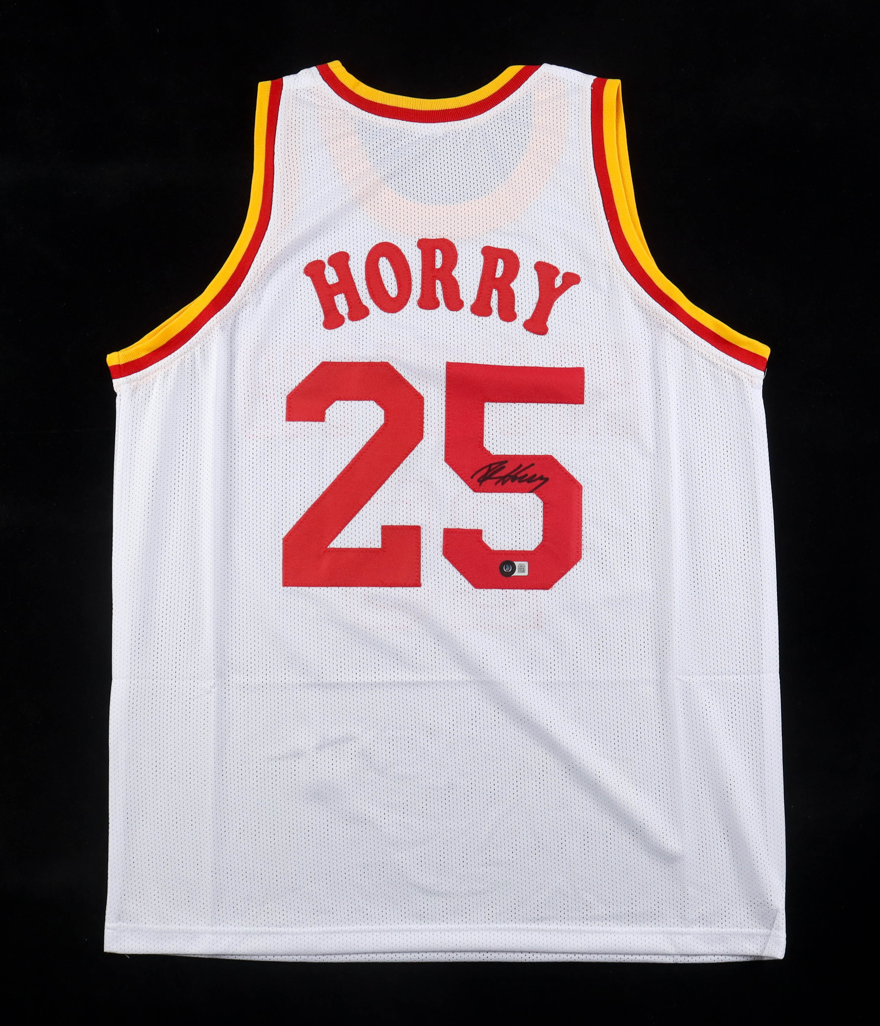 Custom jersey with everything sewn on, size XL. Hand-signed by Robert Horry.
