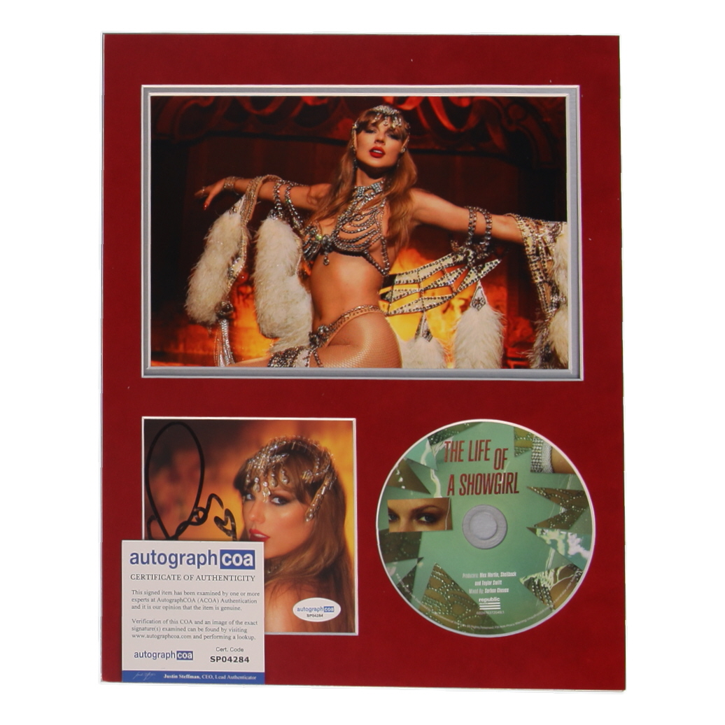 Custom matted display measures approximately 11" x 14" in size. Features a "The Life of a Showgirl" CD insert that has been hand-signed by Taylor Swift. The disc is included as shown.