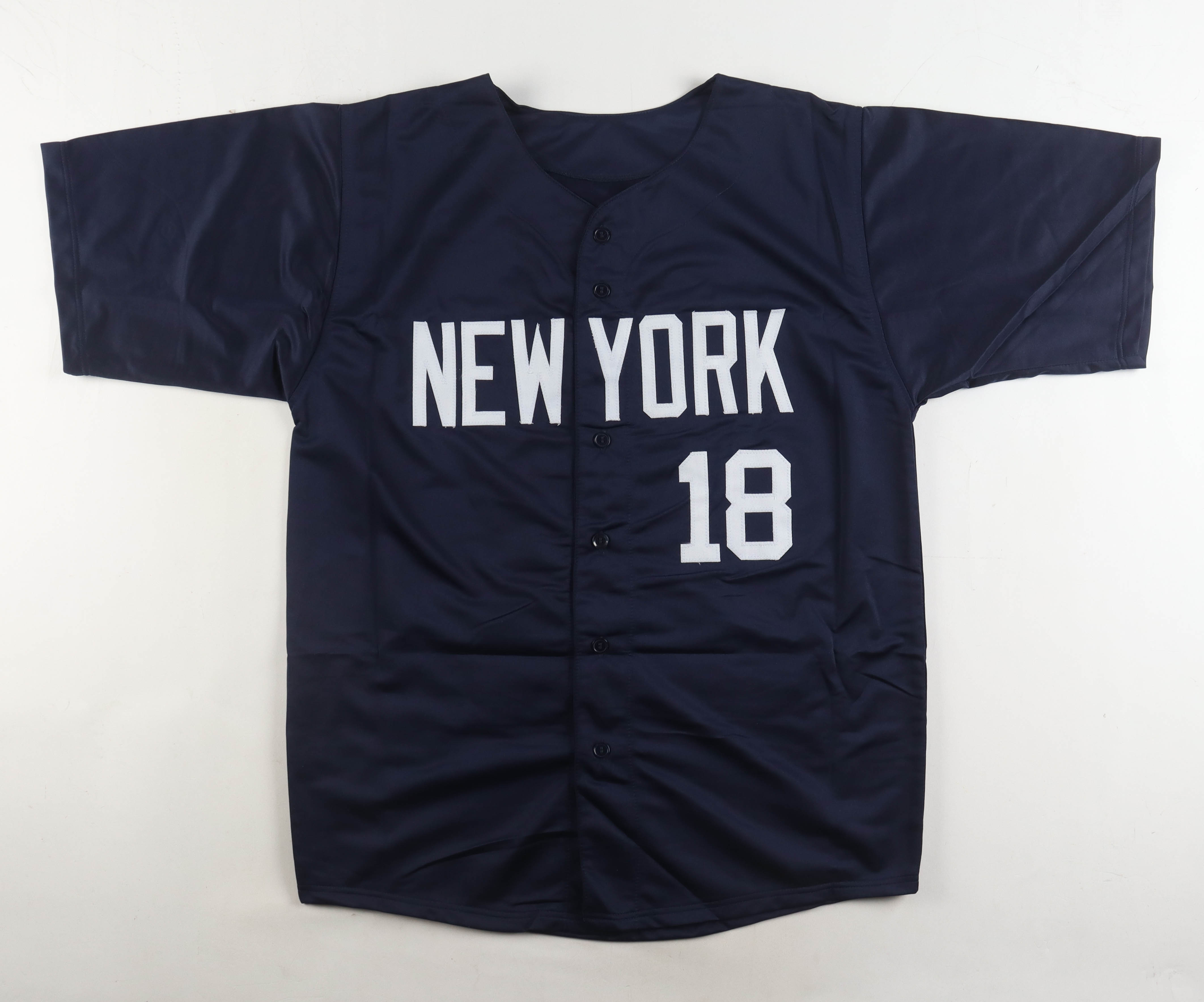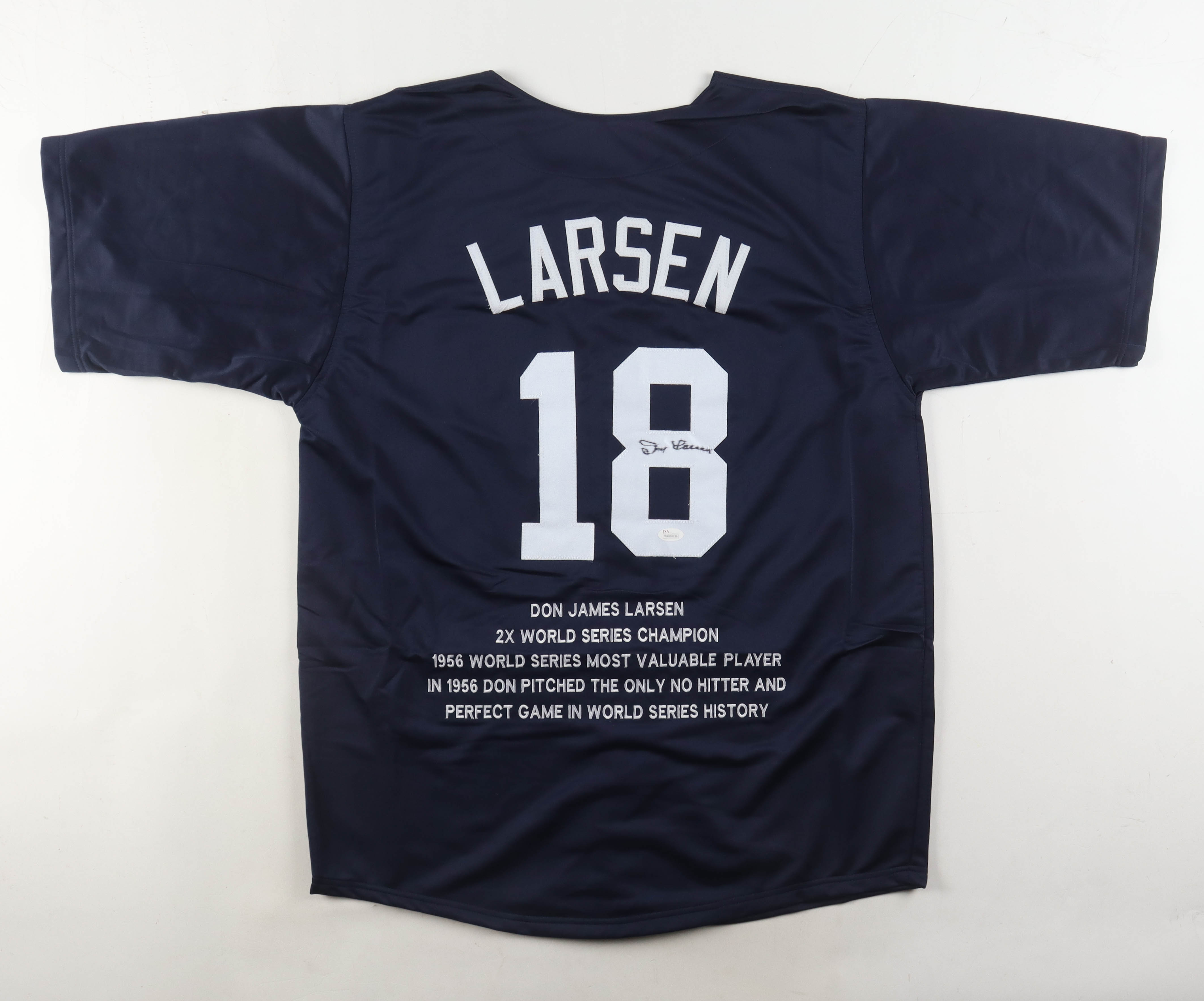 Custom jersey with everything sewn on, size XL. Hand-signed by Don Larsen (D. 2020). Larsen' s career highlights have been custom stitched onto the back of the jersey below the reverse numbers. Please note, the signature has bled.