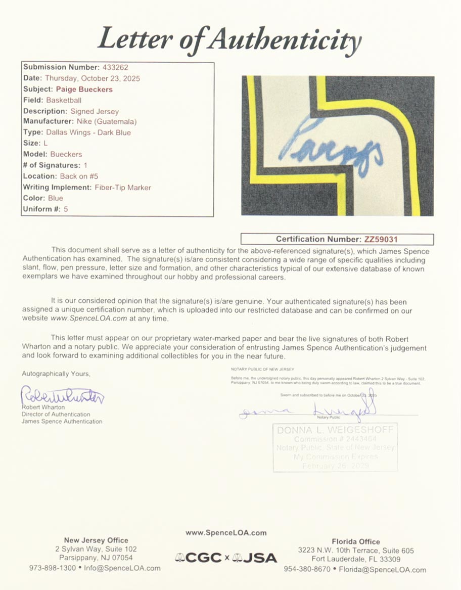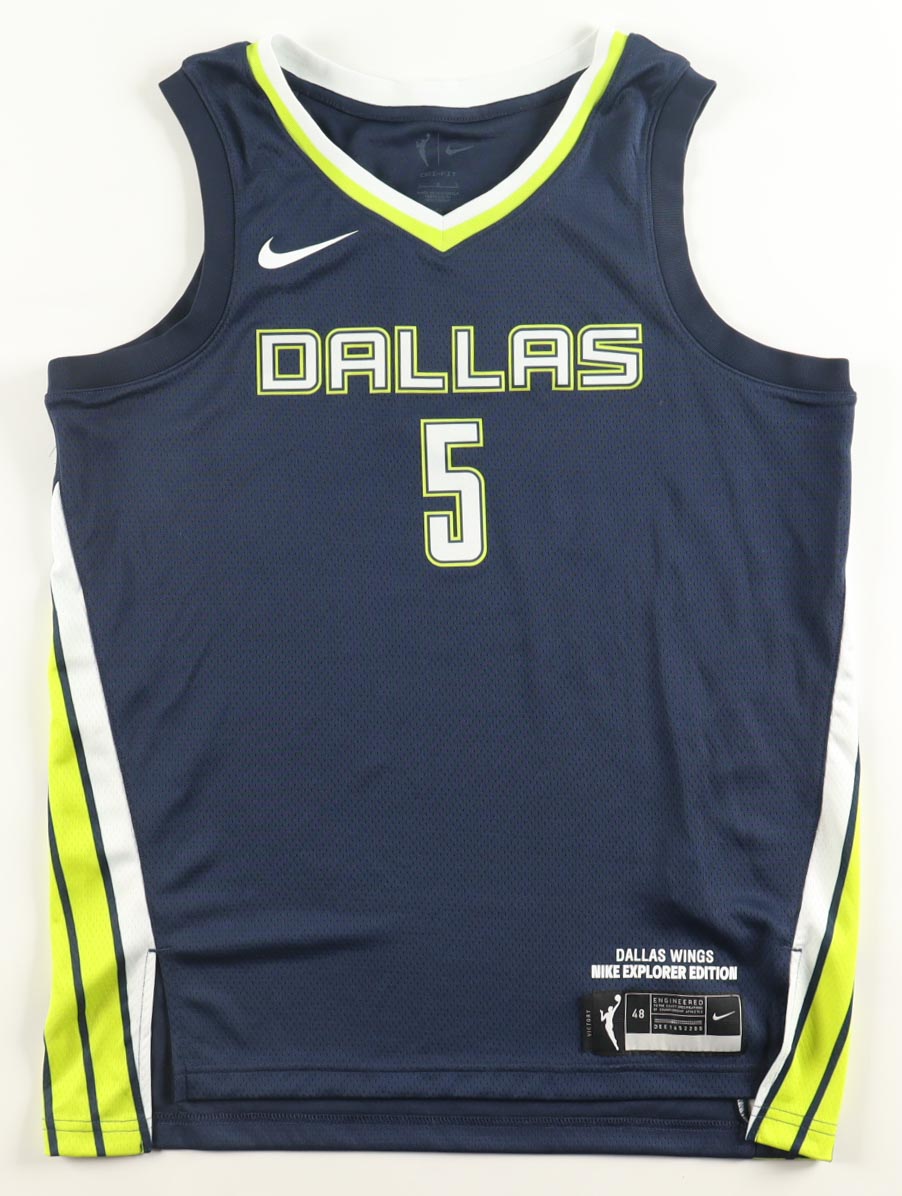 Nike authentic jersey with everything pressed on, size L. Hand-signed by Paige Bueckers (Dallas Wings).