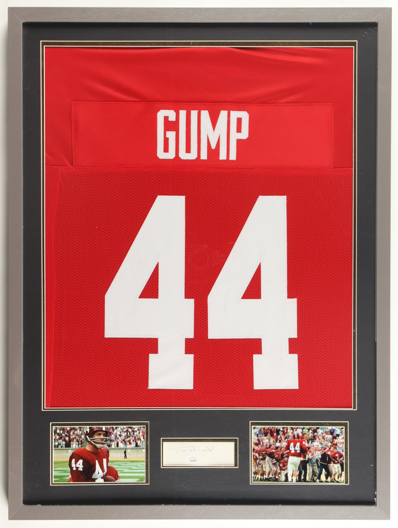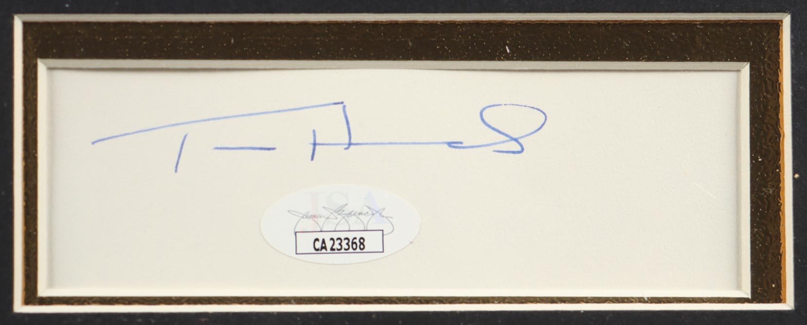 Custom frame measures approximately 23" x 31" in size and features a cut that has been hand-signed by Tom Hanks (Forrest Gump). The display also includes an unsigned jersey.