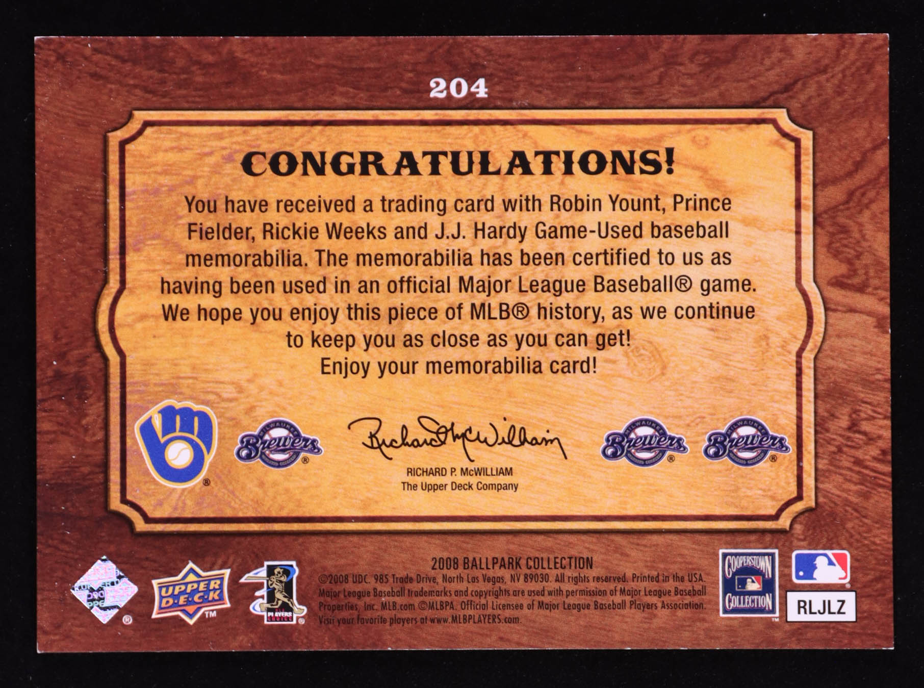 Robin Yount / Prince Fielder / Rickie Weeks / J.J. Hardy 2008 Upper Deck Ballpark Collection #204