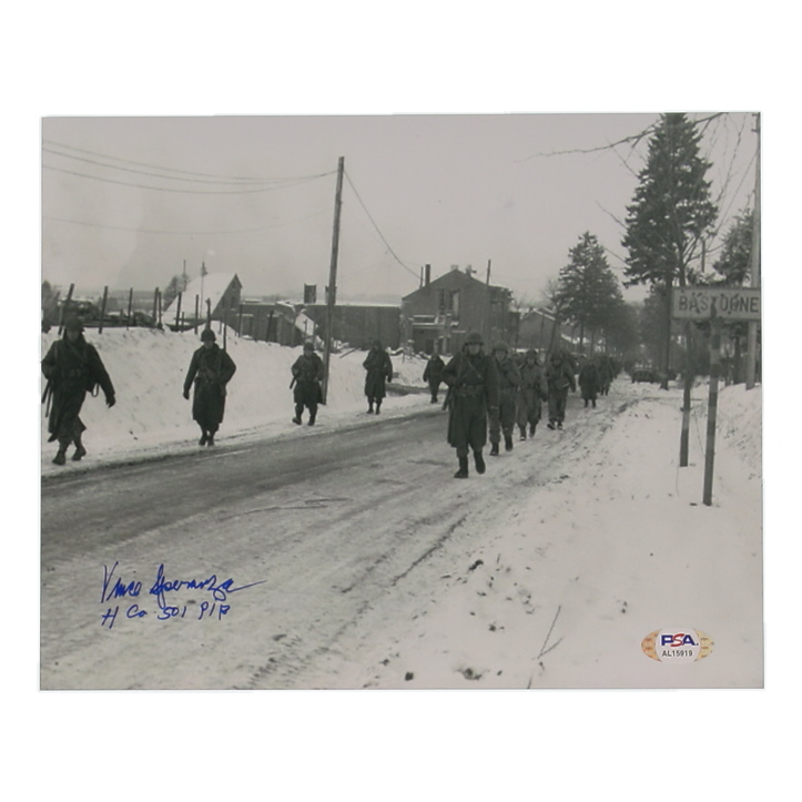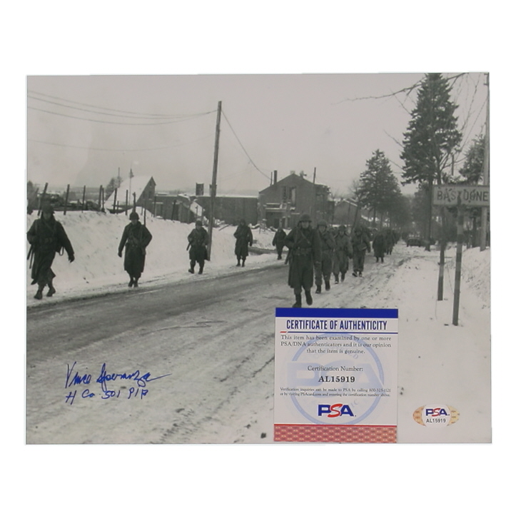 Photo measures approximately 8" x 10" in size. Hand-signed and inscribed by Vincent Speranza (D. 2023, Private, Solo mission in Bastogne for food and drink for fallen comrades).