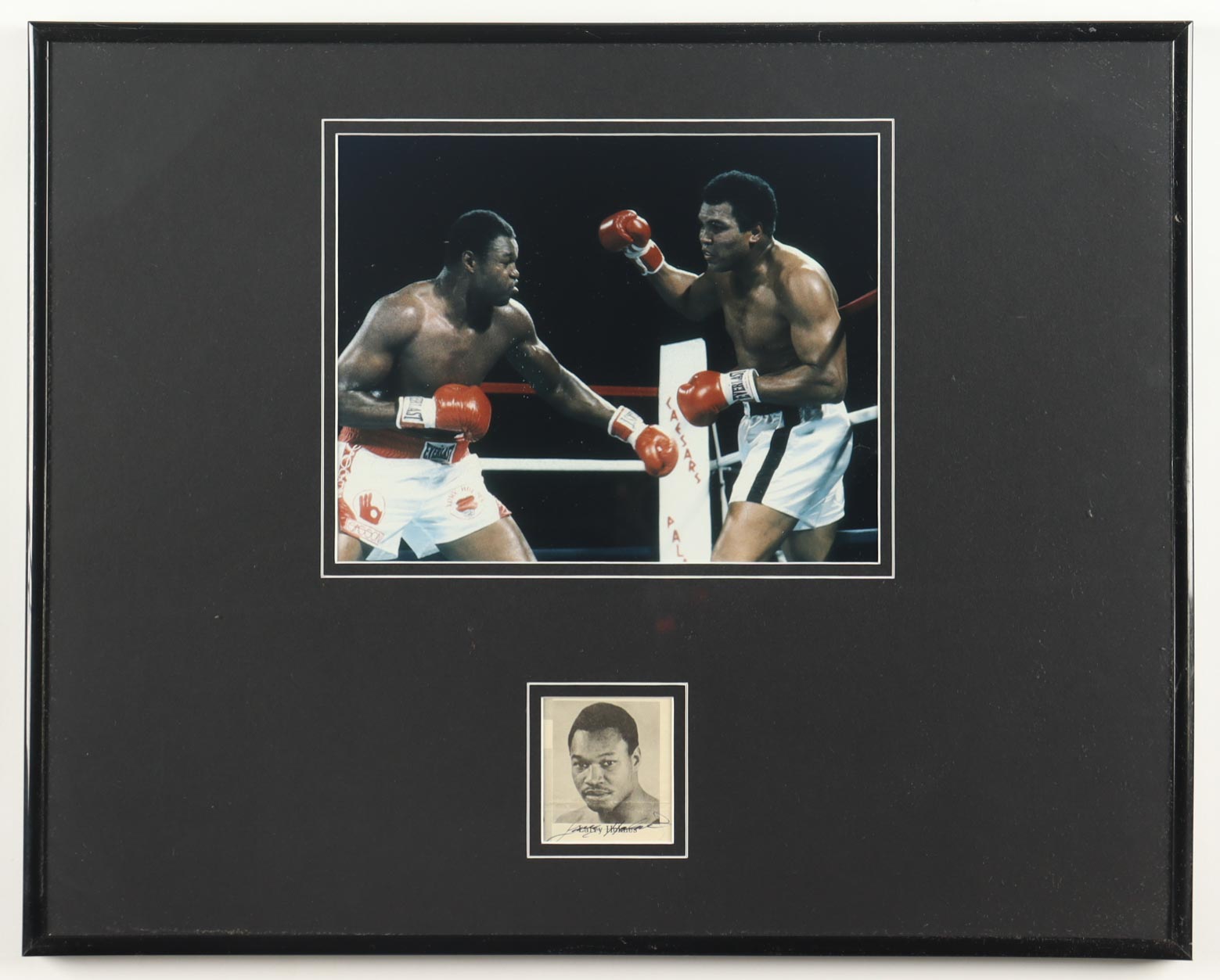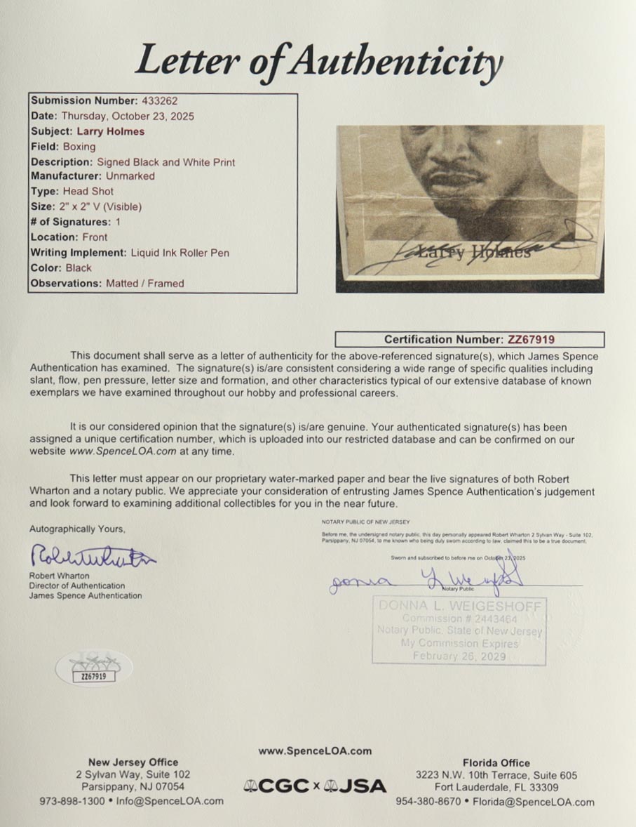 Custom frame measures approximately 16" x 20" in size and features a 2.5" x 2.5" photo that has been hand-signed by Larry Holmes (HOF).