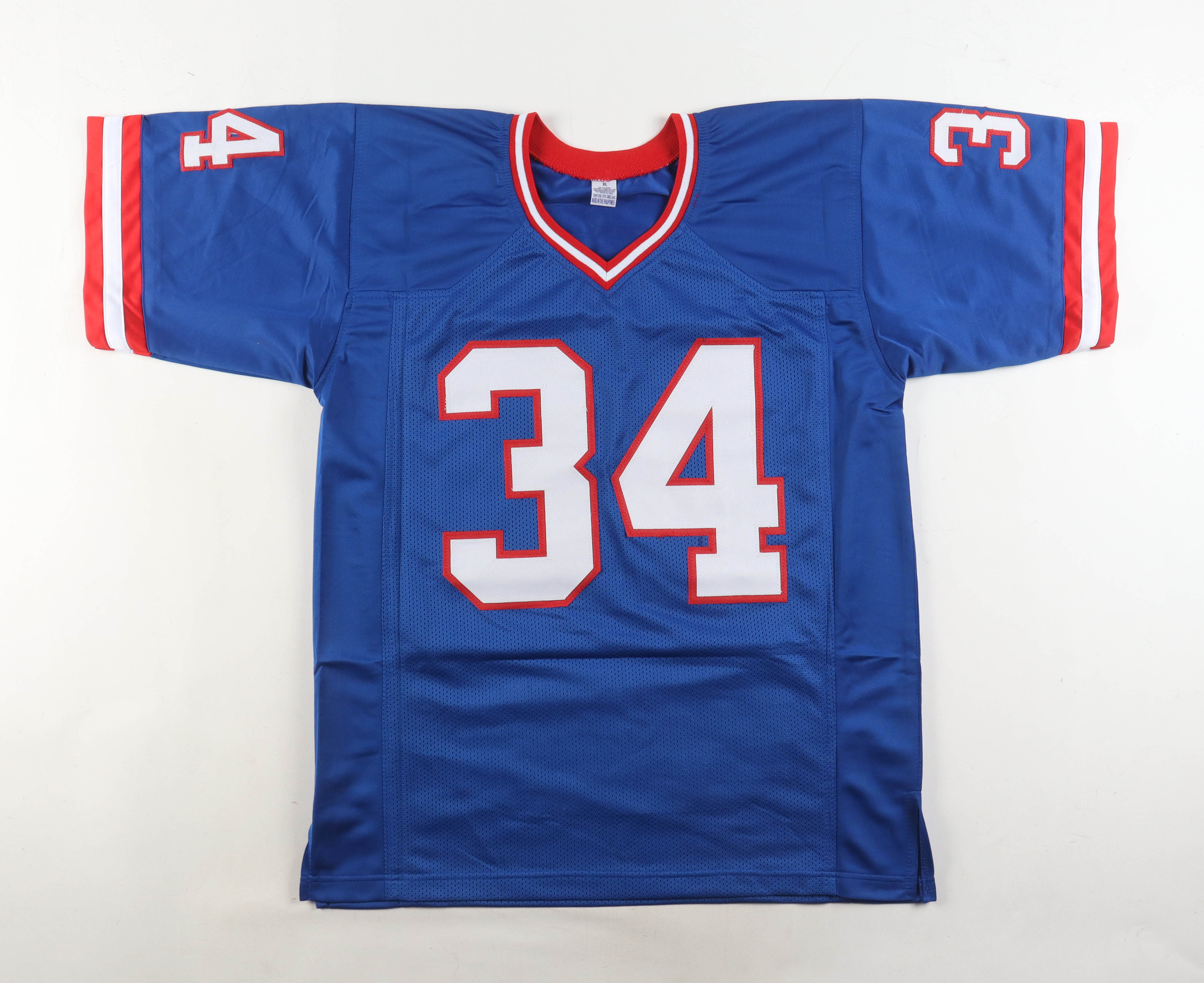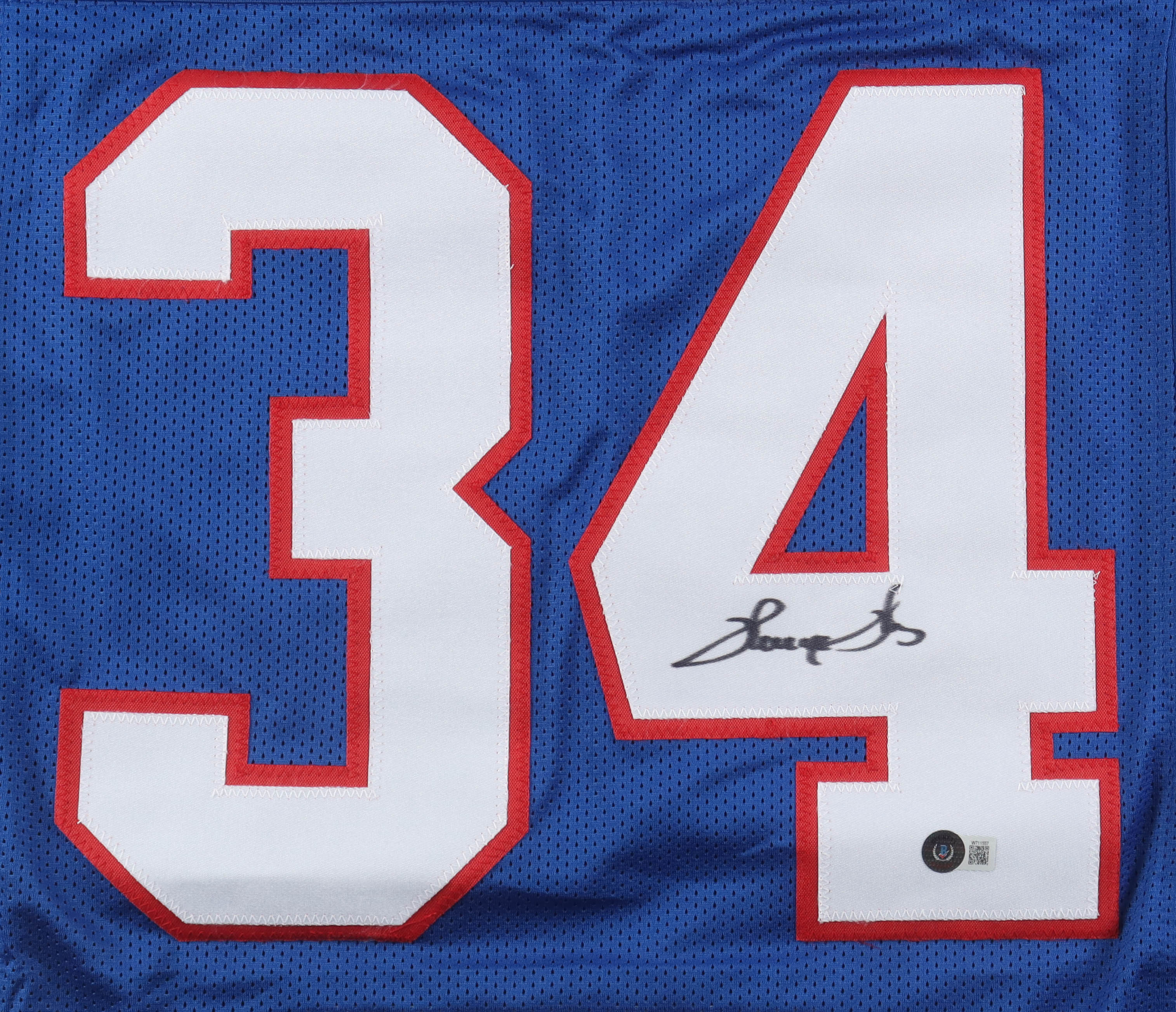 Custom jersey with everything sewn on, size XL. Hand-signed by Thurman Thomas (HOF). Thomas's career highlights have been custom stitched onto the back of the jersey below the reverse numbers.