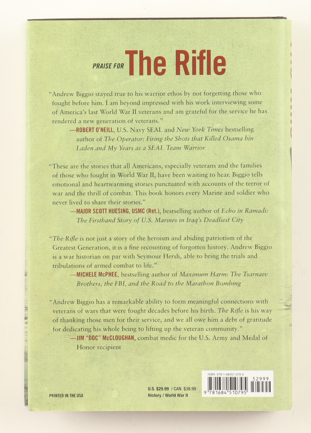 In The Rifle: Combat Stories from America’s Last WWII Veterans, Told Through an M1 Garand, Biggio presents a remarkable oral history project centered on a single, iconic artifact—the M1 Garand rifle—signed and held by over 200 veterans who once carried the weapon in combat. The book blends moving personal narratives, battlefield recollections, and Biggio’s own reflections as a Marine, creating an enduring tribute to the courage, sacrifice, and humanity of the Greatest Generation.