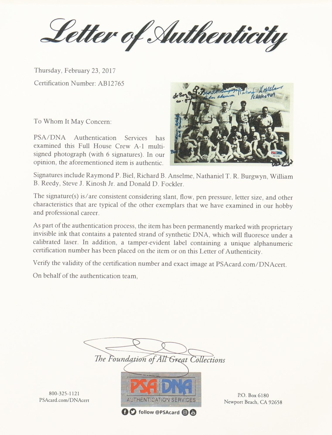 This PSA/DNA authenticated photograph—featuring six authentic signatures of Full House crew members—is a rare and historically important artifact directly tied to the most consequential air operations of the 20th century.