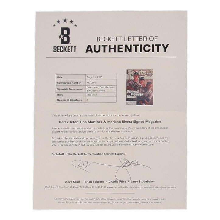 Derek Jeter, Mariano Rivera, & Tino Martinez Signed 1998 Sports Illustrated Magazine (Beckett)