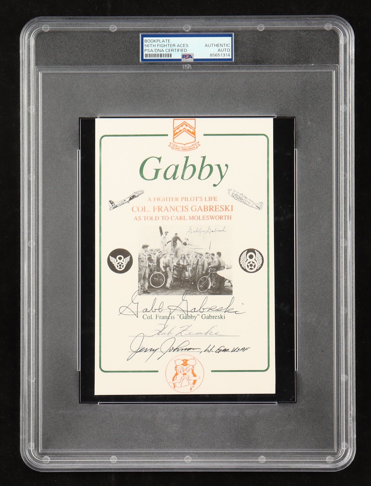 Presented is an exceptional hand-signed bookplate from Gabby: A Fighter Pilot’s Life, personally autographed by three of the most celebrated American fighter aces of World War II: Colonel Francis “Gabby” Gabreski, Brigadier General Gerald W. Johnson, and Colonel Hubert “Hub” Zemke. The signatures have been authenticated and encapsulated by PSA/DNA, ensuring both verification and long-term preservation.