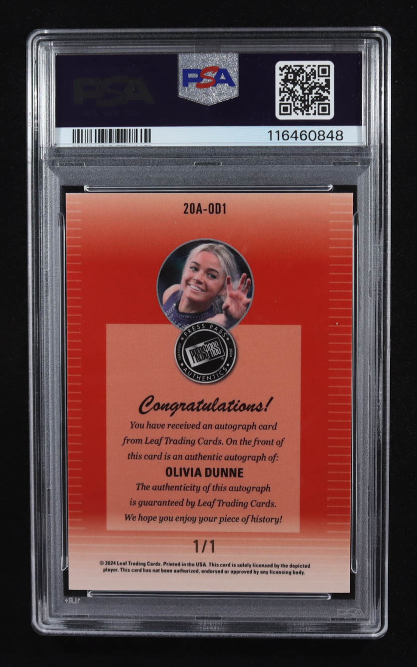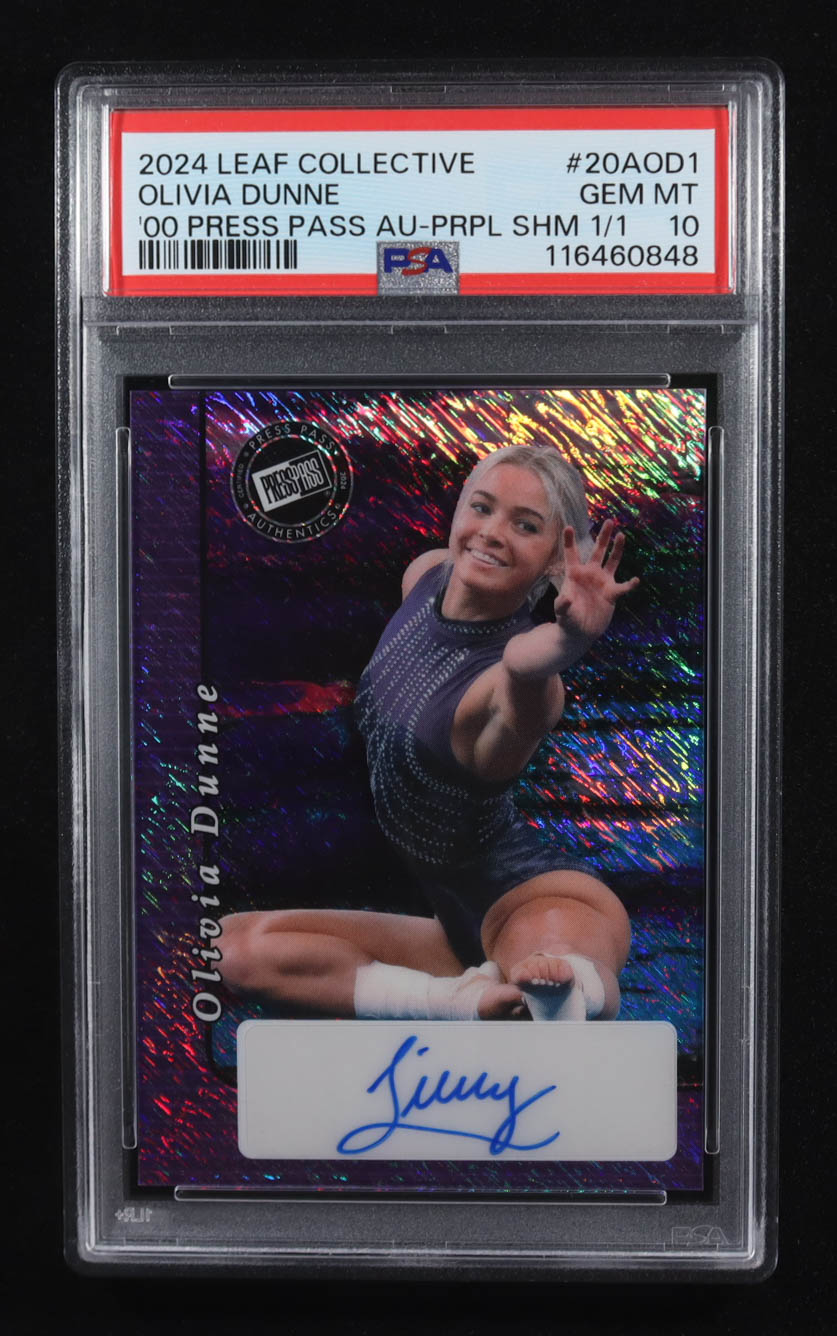 Olivia Dunne 2024 Leaf Collective '00 Press Pass Autographs Shimmer Purple #20AOD1 #1/1 (PSA 10)