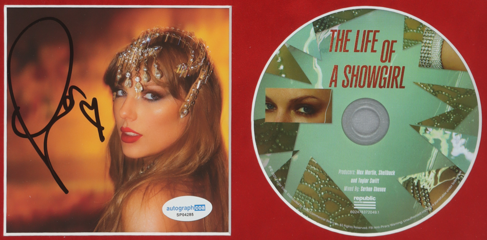 Custom frame measures approximately 13" x 15" in size. Features a "The Life of a Showgirl" CD insert that has been hand-signed by Taylor Swift and includes the disc as shown.