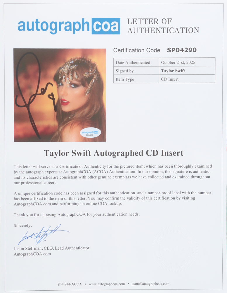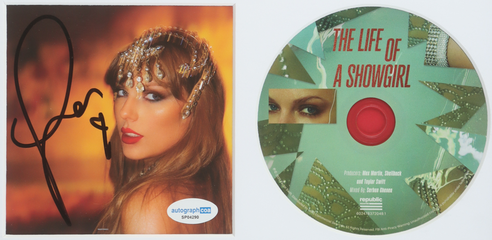 Custom frame measures approximately 13" x 15" in size. Features a "The Life of a Showgirl" CD insert that has been hand-signed by Taylor Swift and includes the disc as shown.