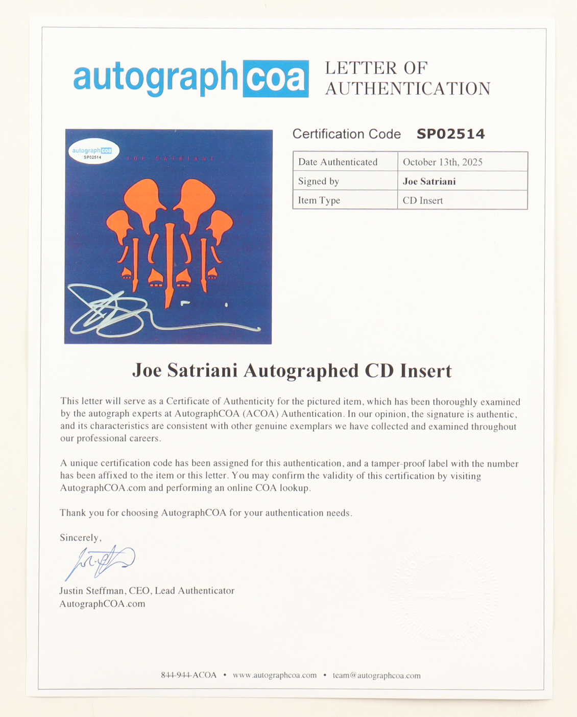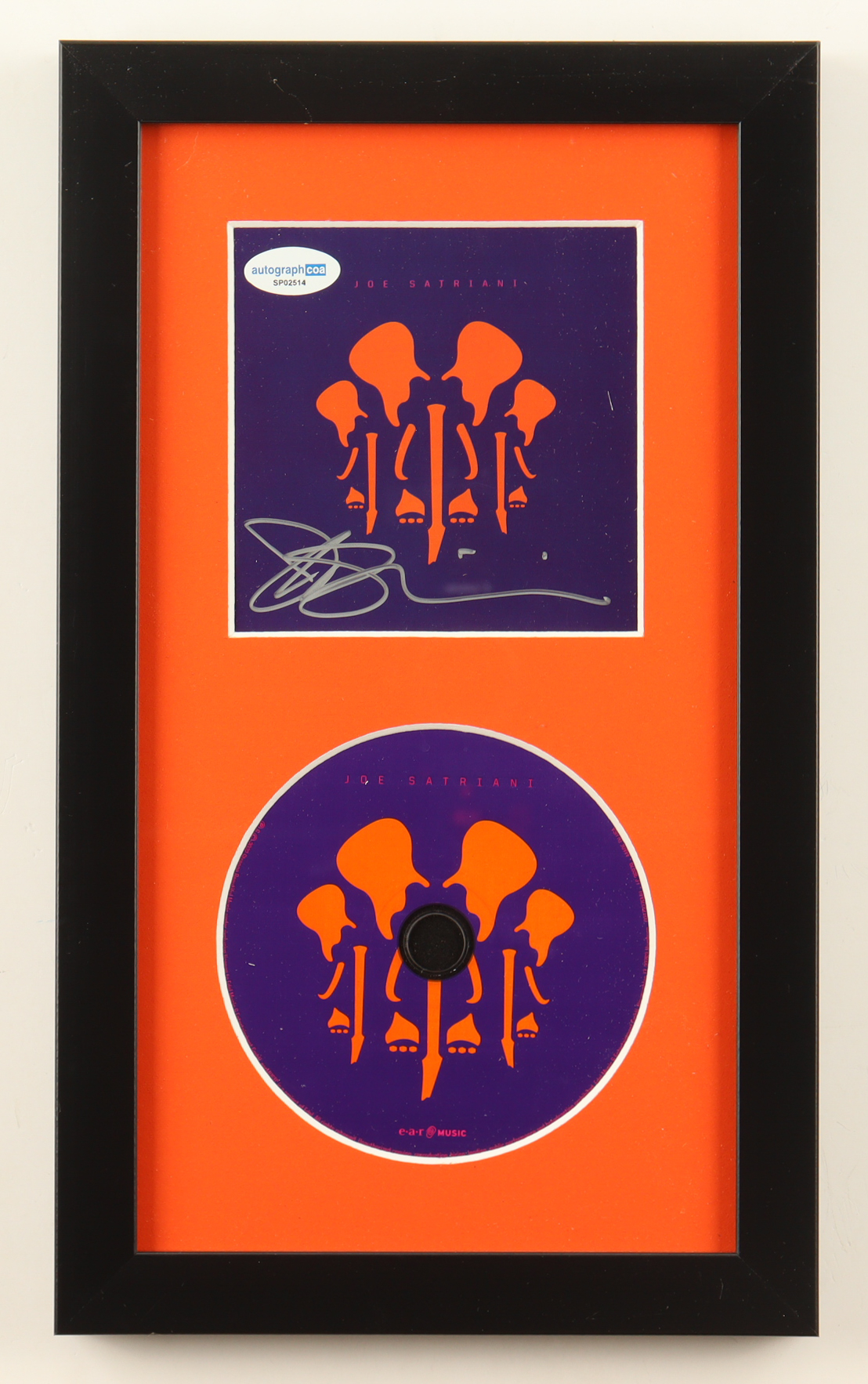 Custom frame measures approximately 8" x 13.5" in size. Features a "The Elephants of Mars" CD insert that has been hand-signed by Joe Satriani. Please note, the disc is included as shown.