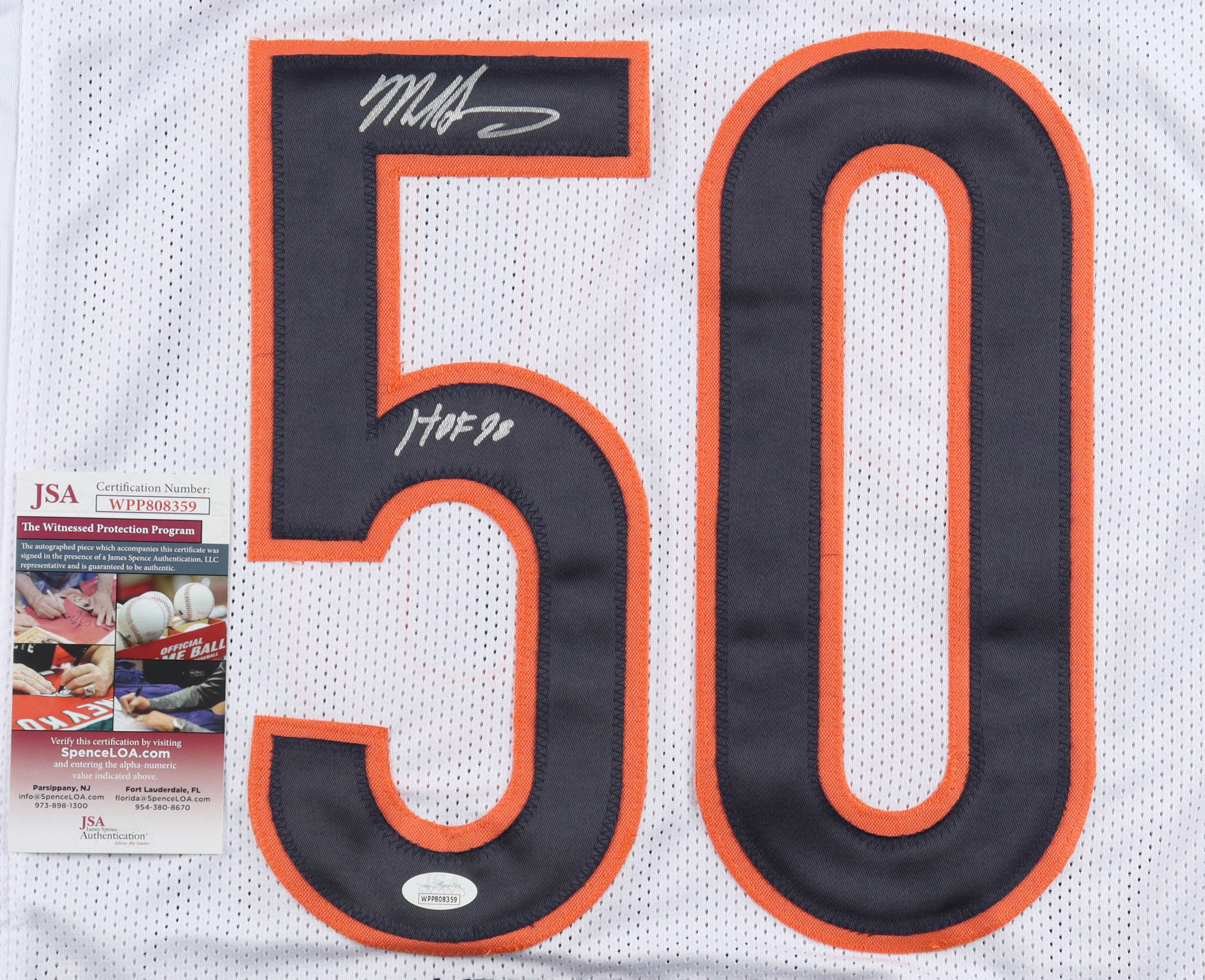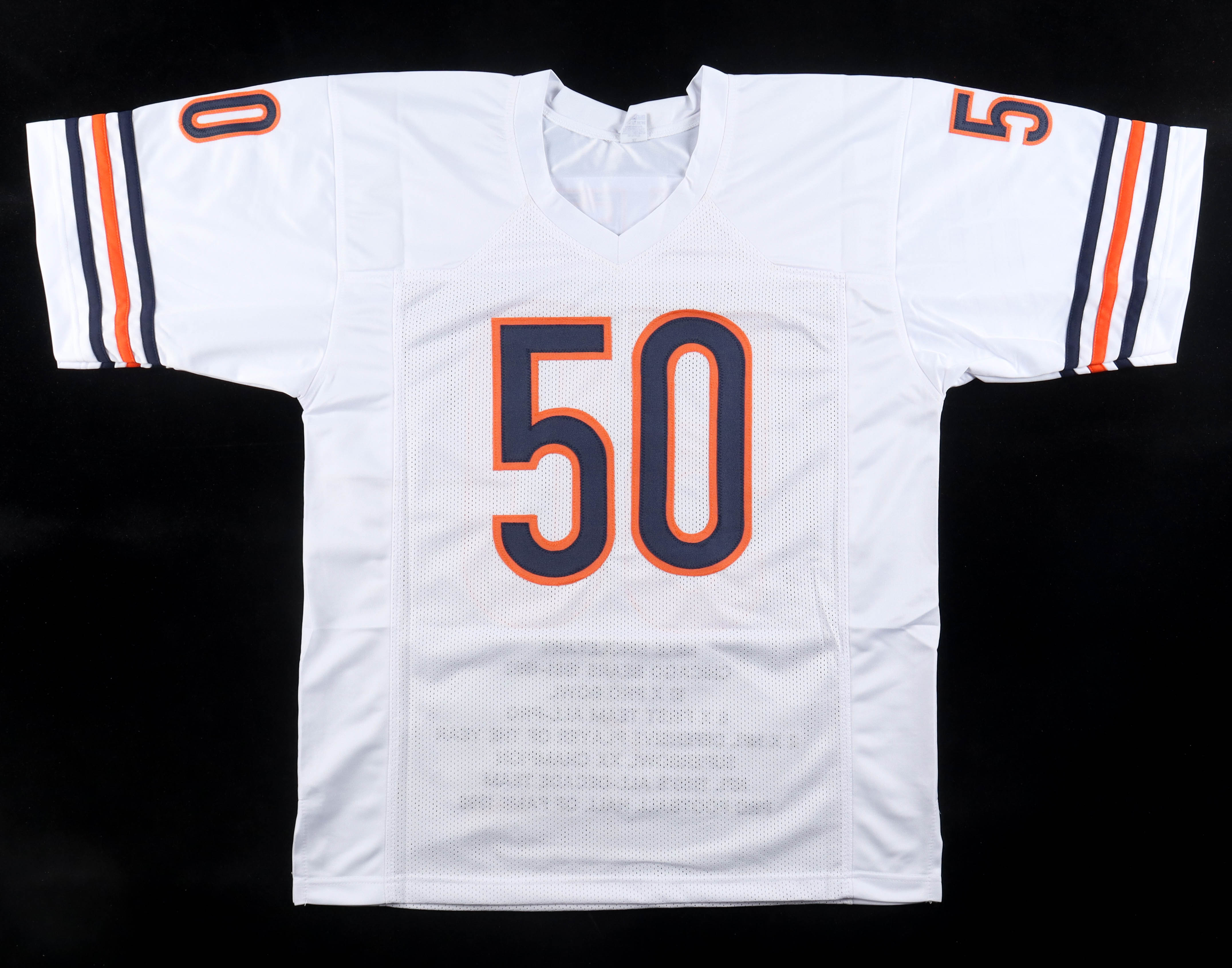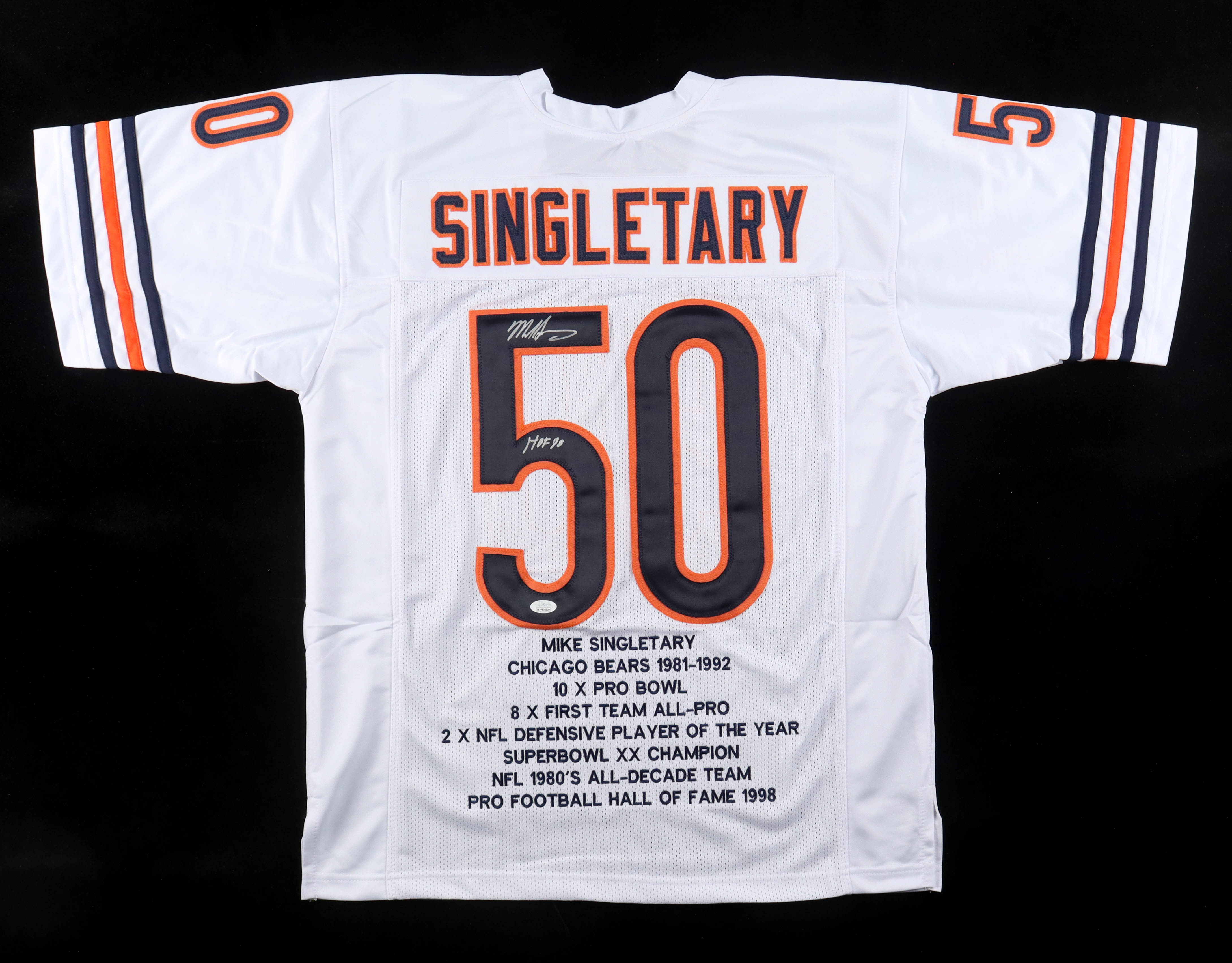Custom jersey with everything sewn on, size XL. Hand-signed and inscribed by Mike Singletary (HOF). Singletary's career stats have been custom stitched in the jersey below the reverse numbers