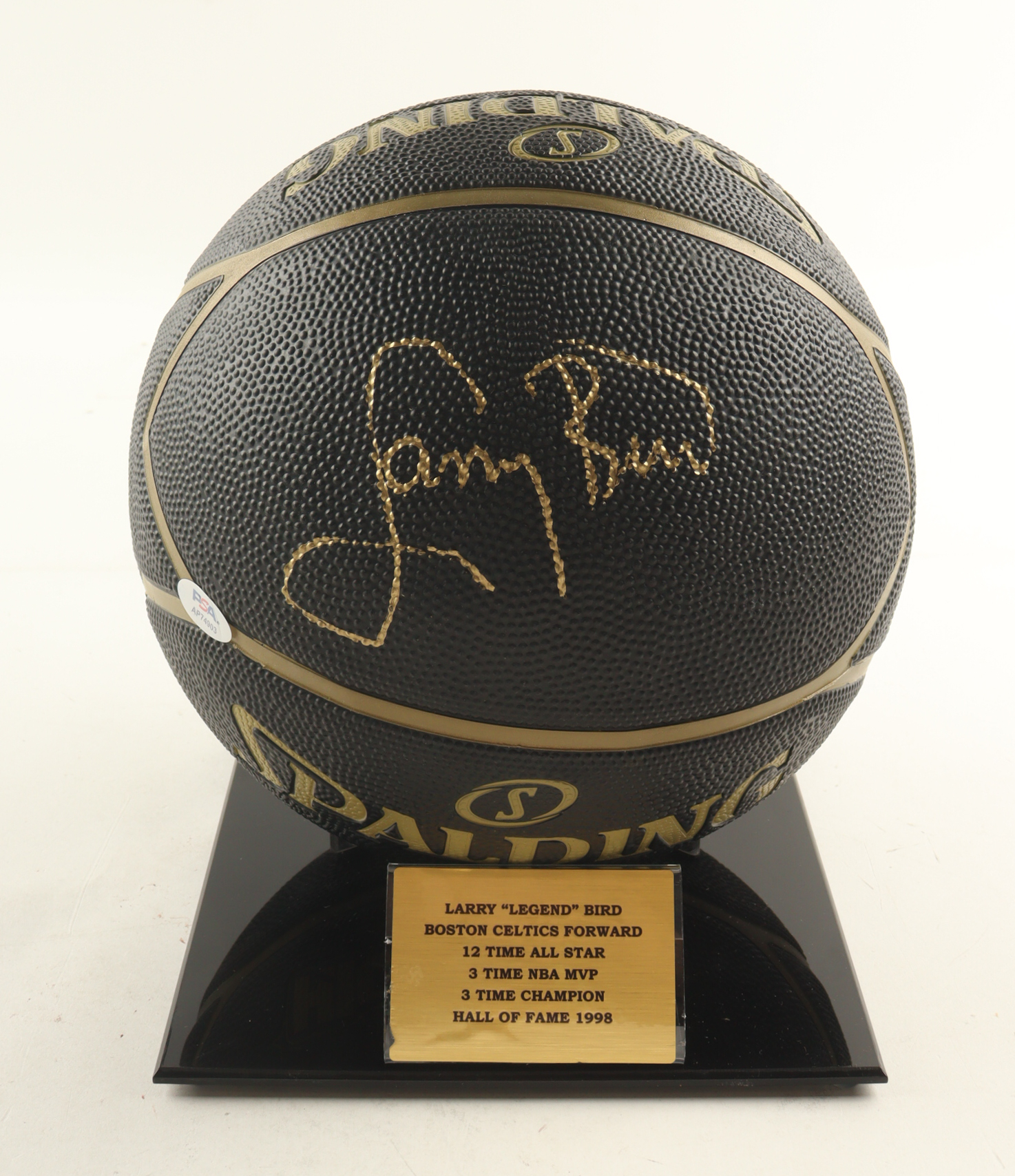Spalding Highlight NBA basketball has been hand-signed by Larry Bird (Boston Celtics, HOF). Display stand and statistics plaque included as shown.