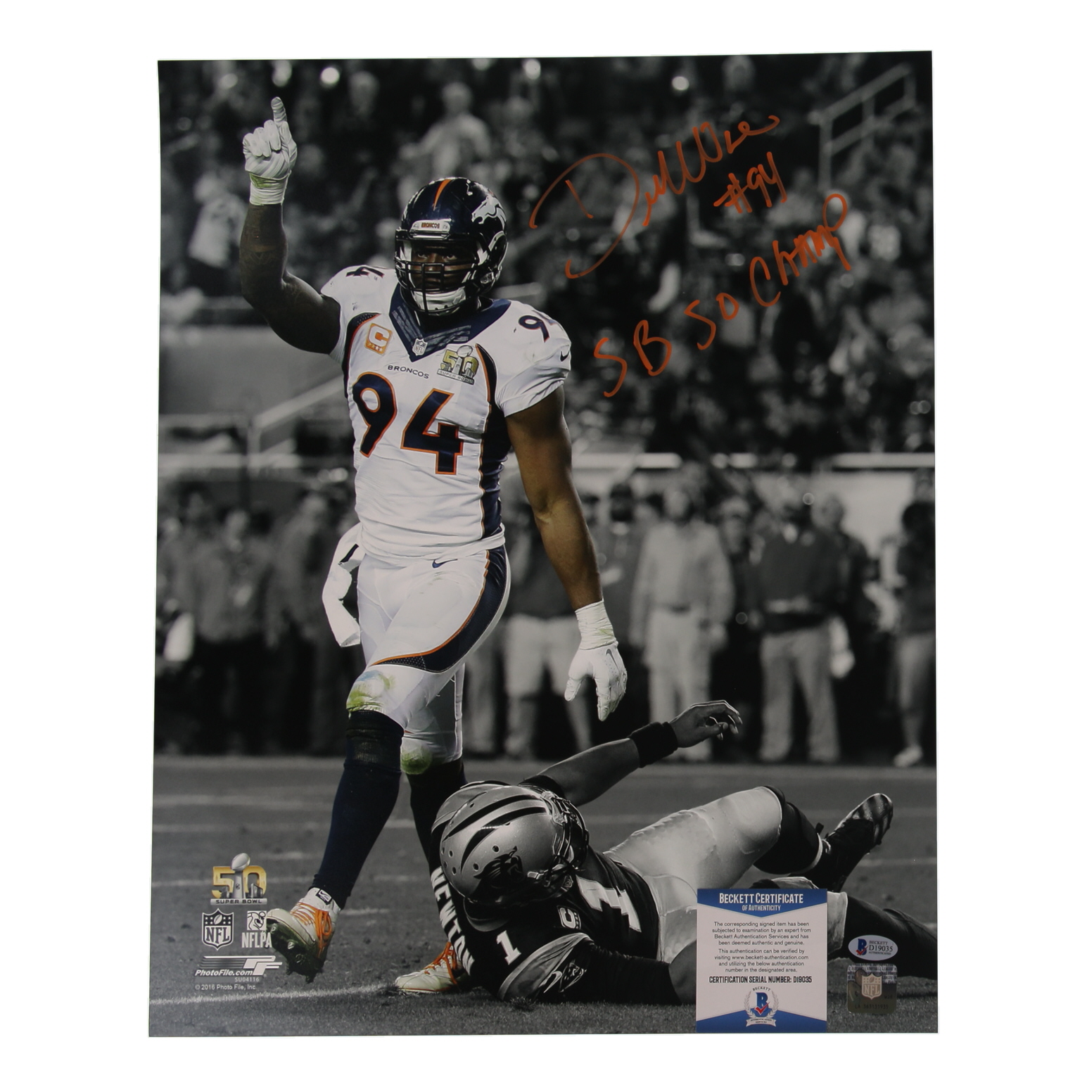 Photo measures 16" x 20" in size. Hand-signed and inscribed by DeMarcus Ware (Denver Broncos, HOF).