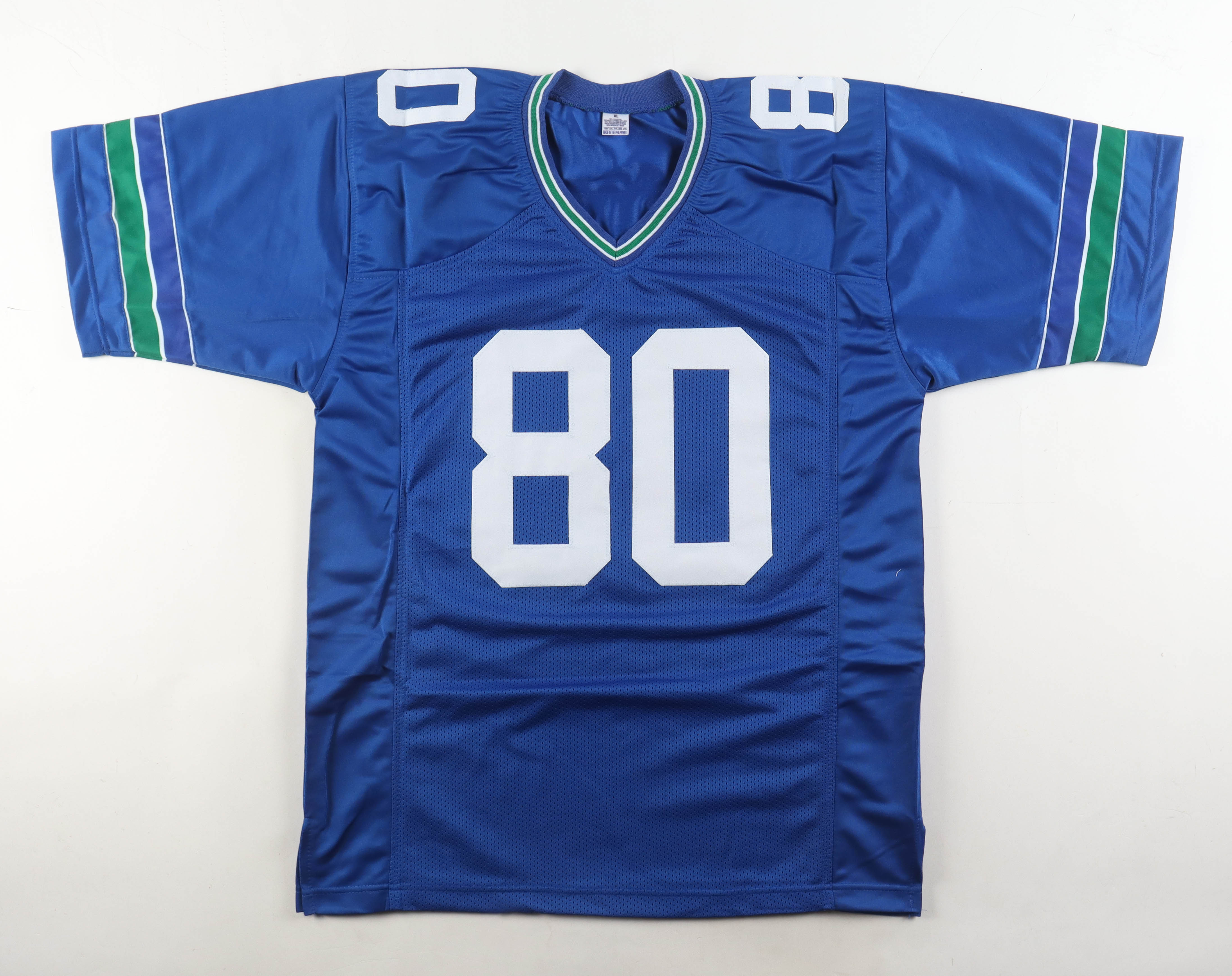 Custom jersey. Everything is sewn on, size XL. Hand-signed and inscribed by Steve Largent (HOF).