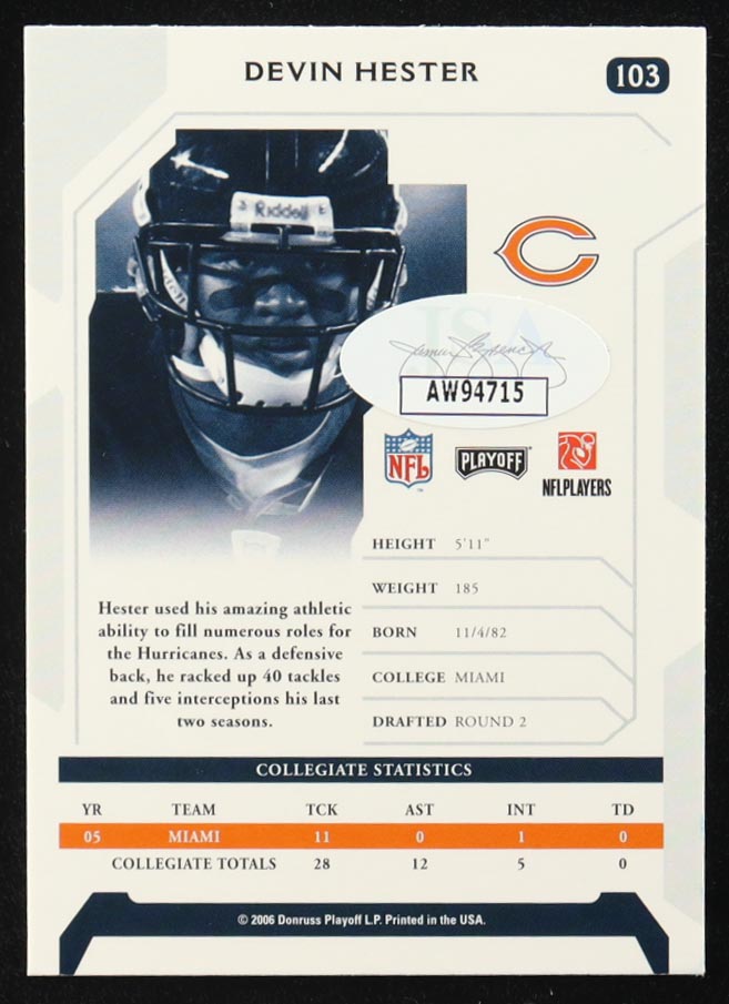 Devin Hester Signed 2006 Playoff NFL Playoffs #103 RC (JSA)
