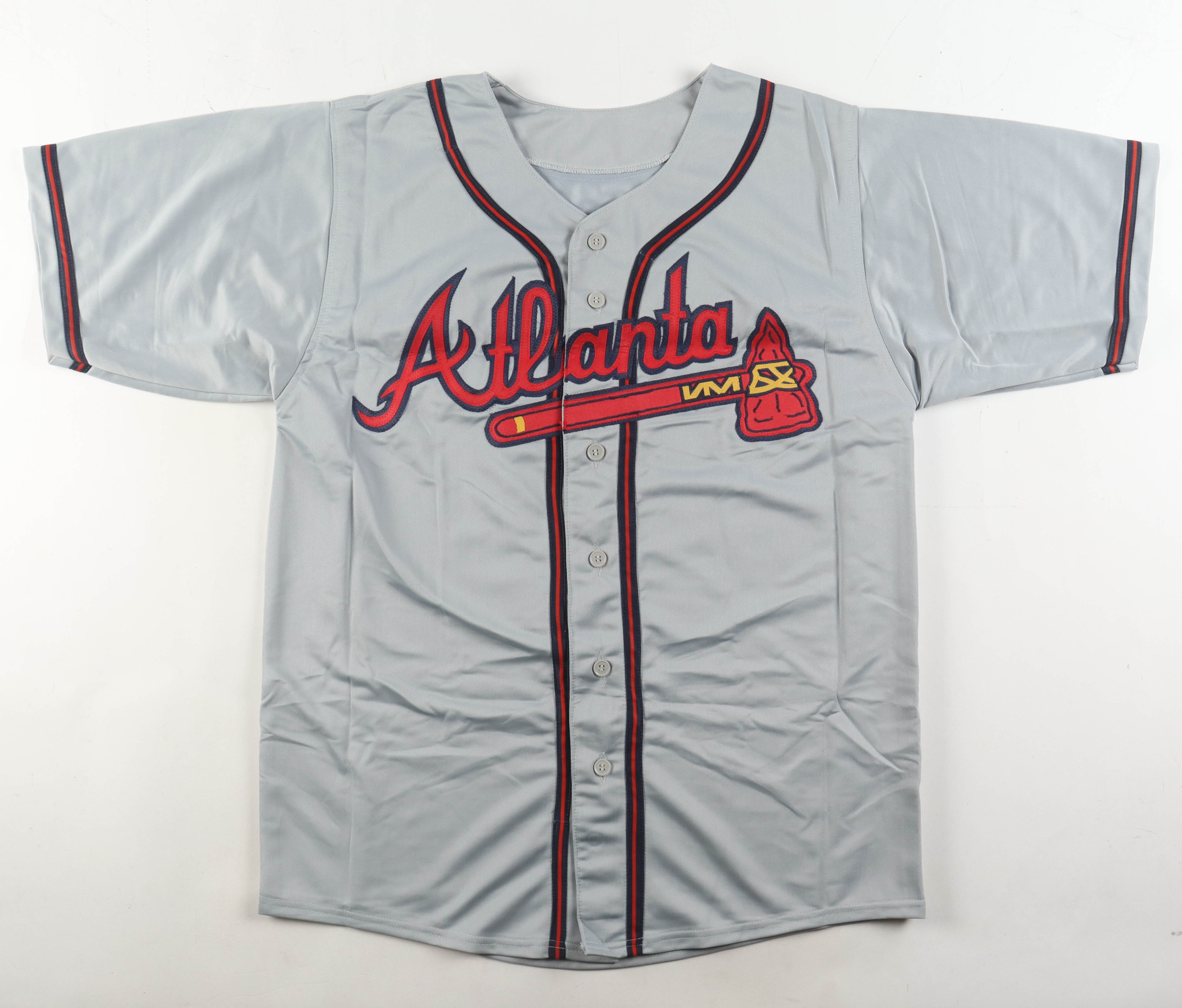 Custom jersey with everything sewn on, size XL. Hand-signed by Ronald Acuna Jr..