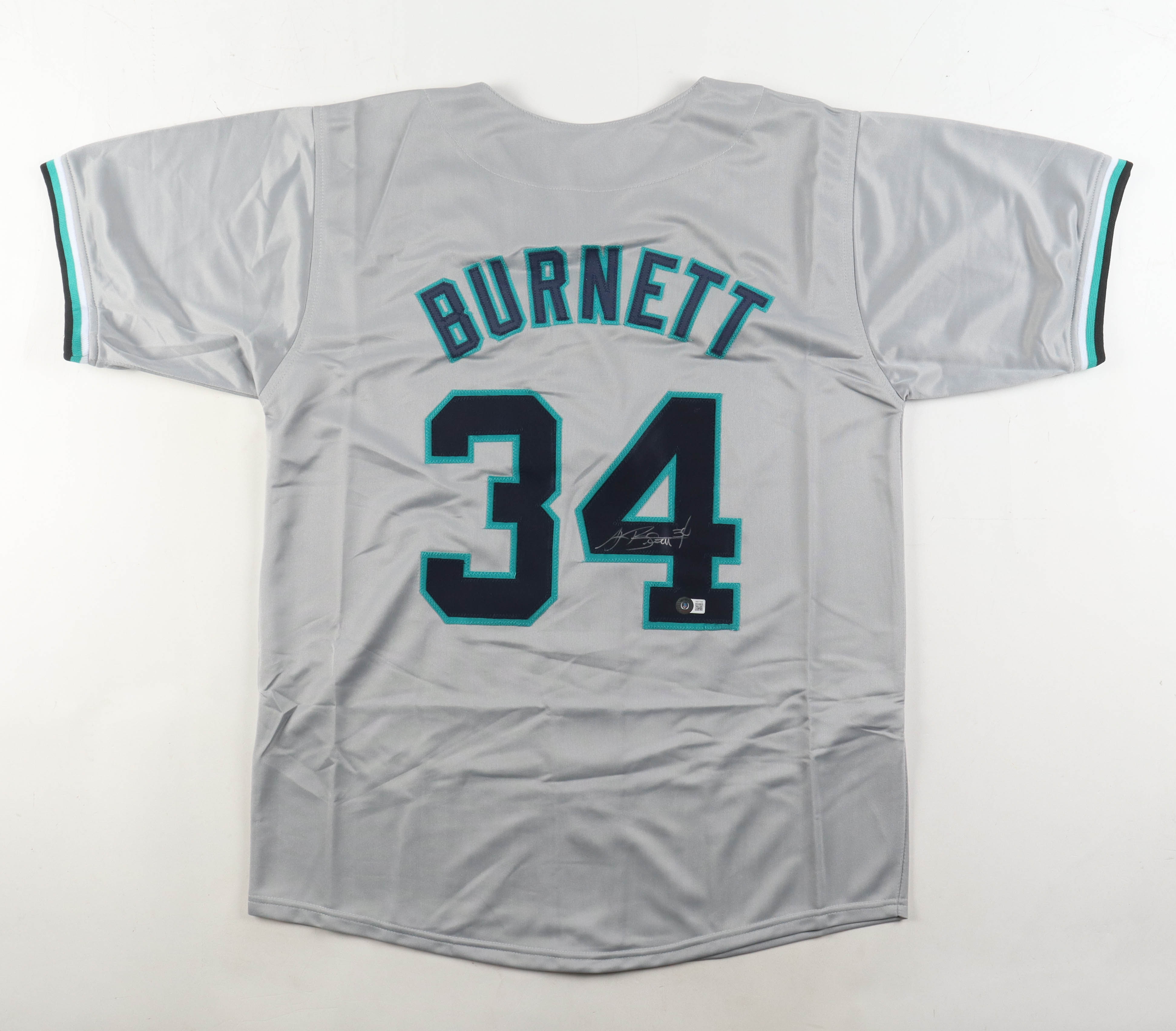 Custom jersey with everything sewn on, size XL. Hand-signed by A. J. Burnett.