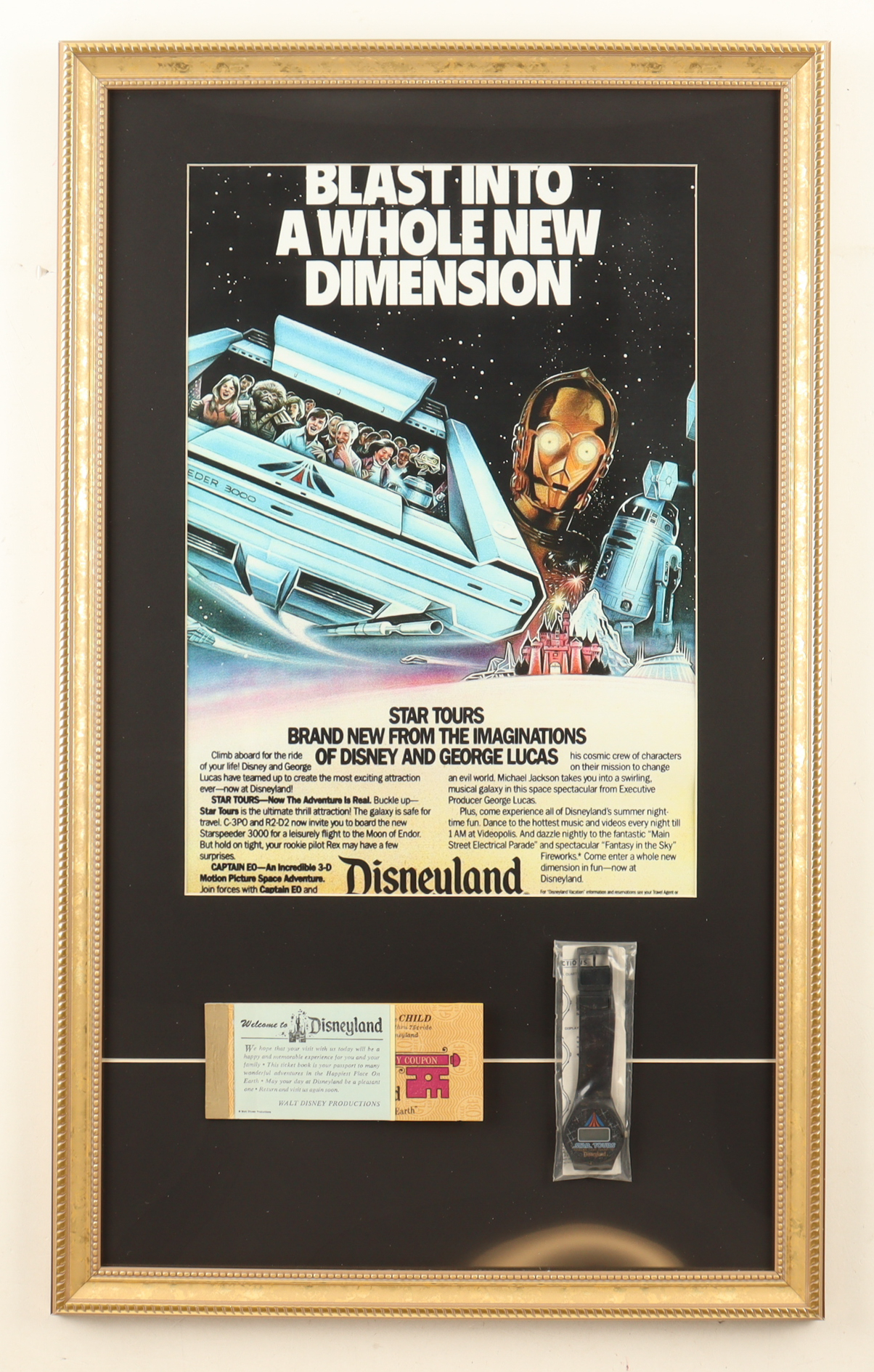 Custom frame measures 17" x 28" in size. Display also includes a "Star Tours" commemorative watch and Disneyland ticketbook.