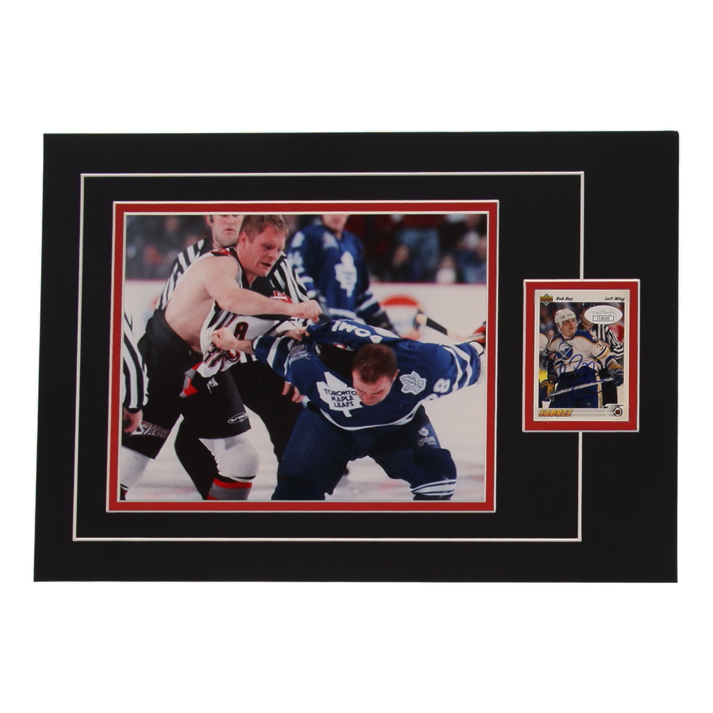 Custom display measures approximately 12" x 17" in size and features a sports card that has been hand-signed by Rob Ray (Toronto Maple Leafs). The display also features an 8" x 10" photo.