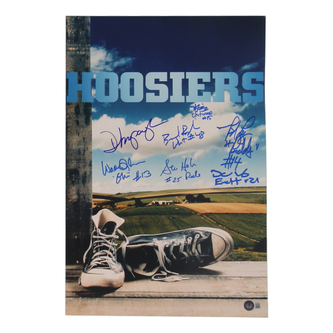 Photo measures approximately 12" x 18" in size and has been hand-signed and inscribed by David Anspaugh (Director), Wade Schenck (Ollie), Brad Boyle (Whit Butcher), Steve Hollar (Rade), Maris Valainis (Jimmy Chitwood), Steve Hollar (Rade), Brad Long (Buddy), and David Neidorf (Everett Fletch).