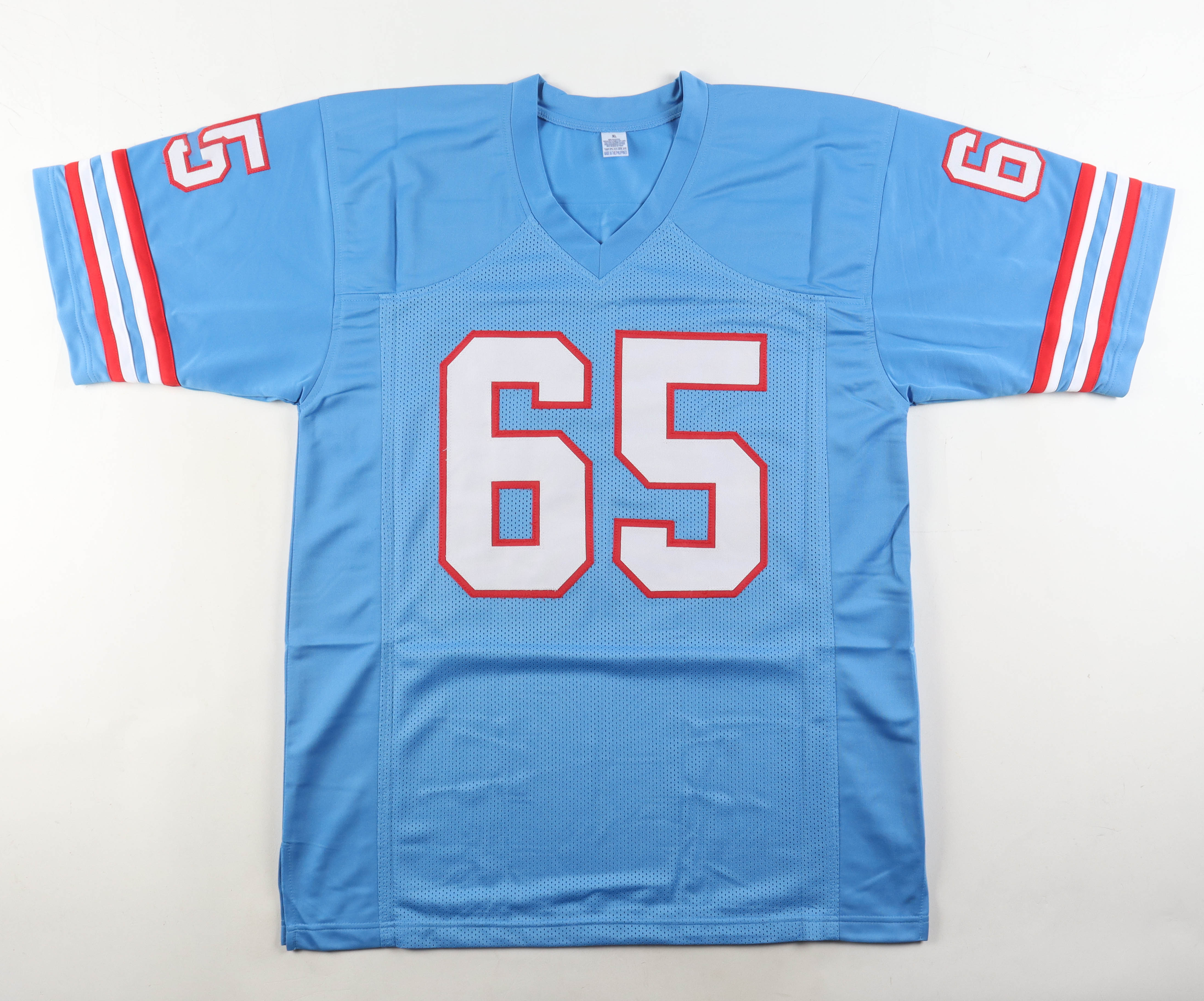 Custom jersey. Everything sewn on, size XL. Hand-signed and inscribed by Elvin Bethea (HOF).
