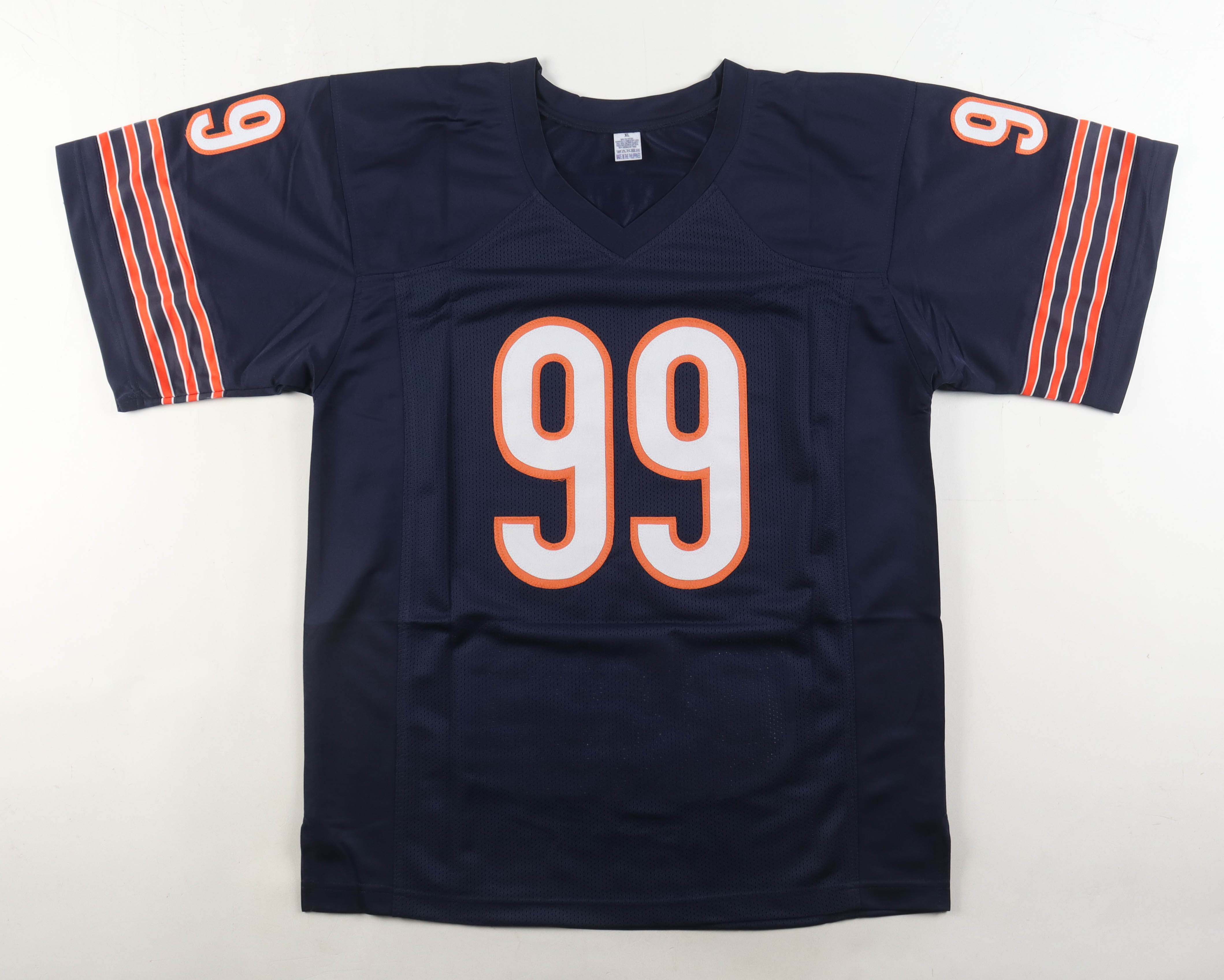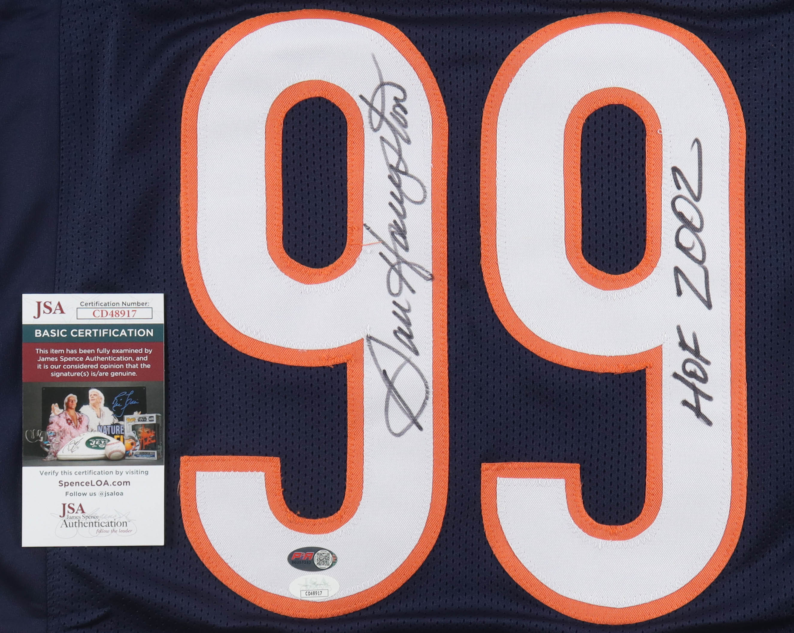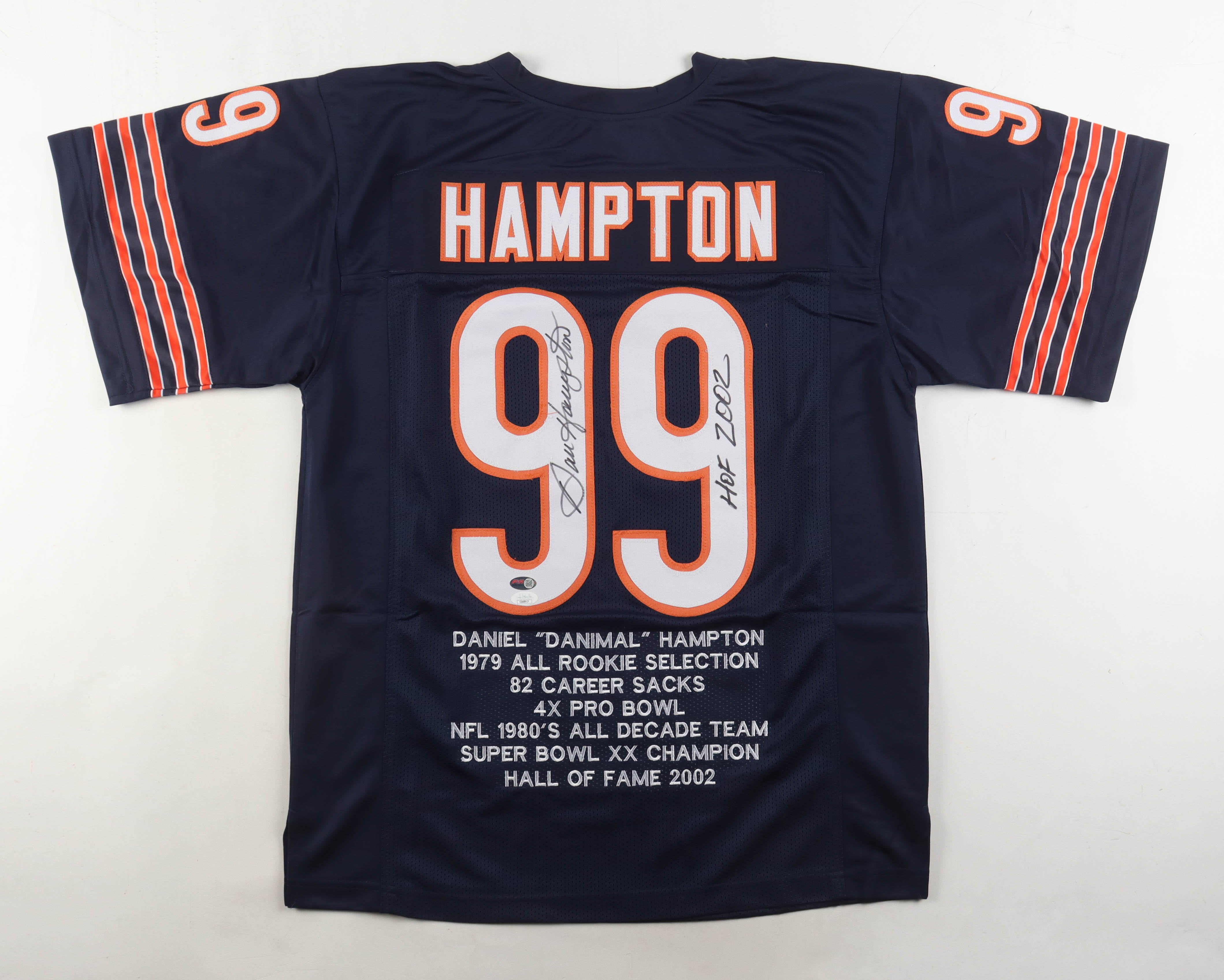 Custom jersey. Everything is sewn on, size XL. Hand-signed and inscribed by Dan Hampton (HOF). Hampton's career highlights have been custom stitched onto the back of the jersey below the reverse numbers.
