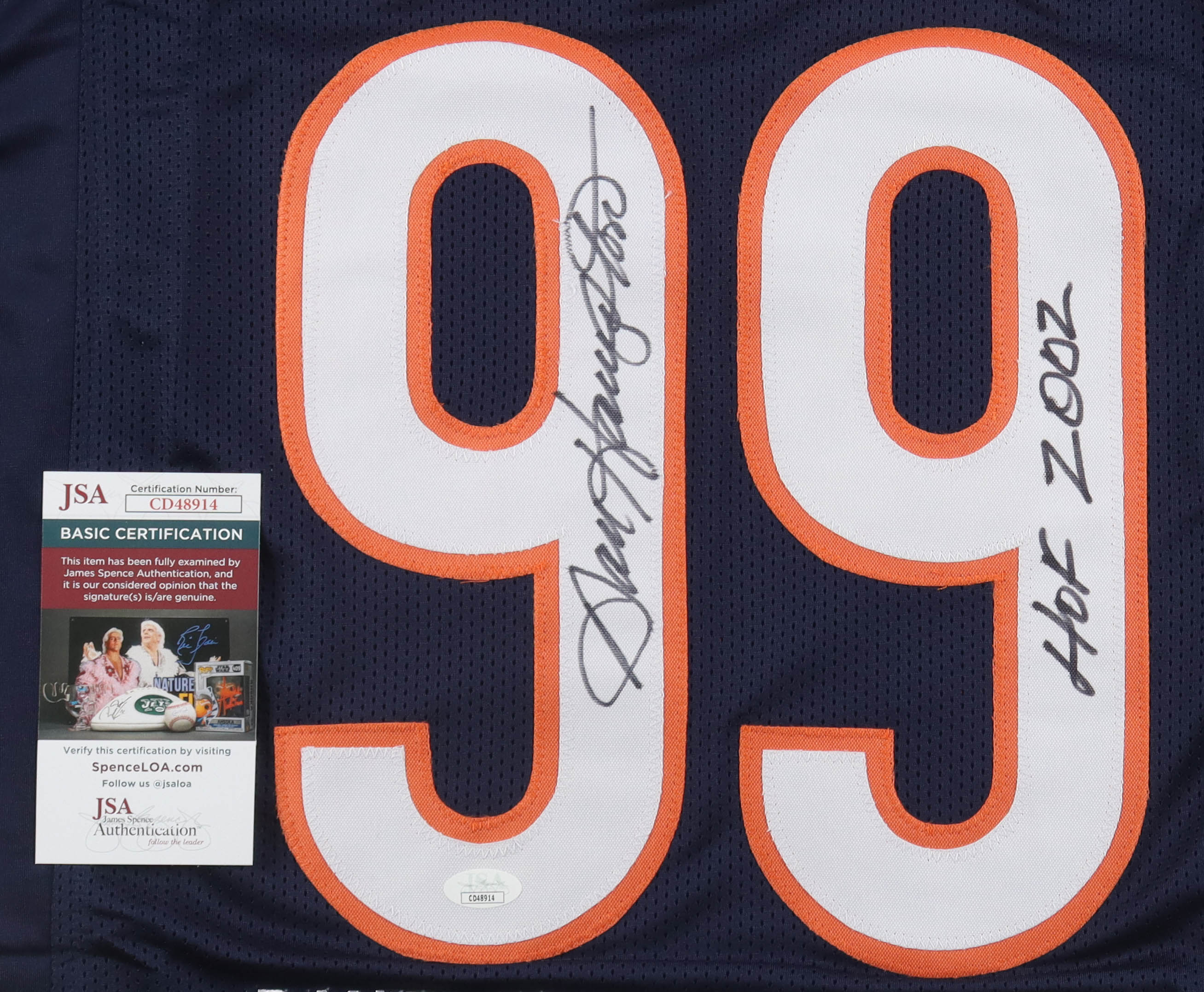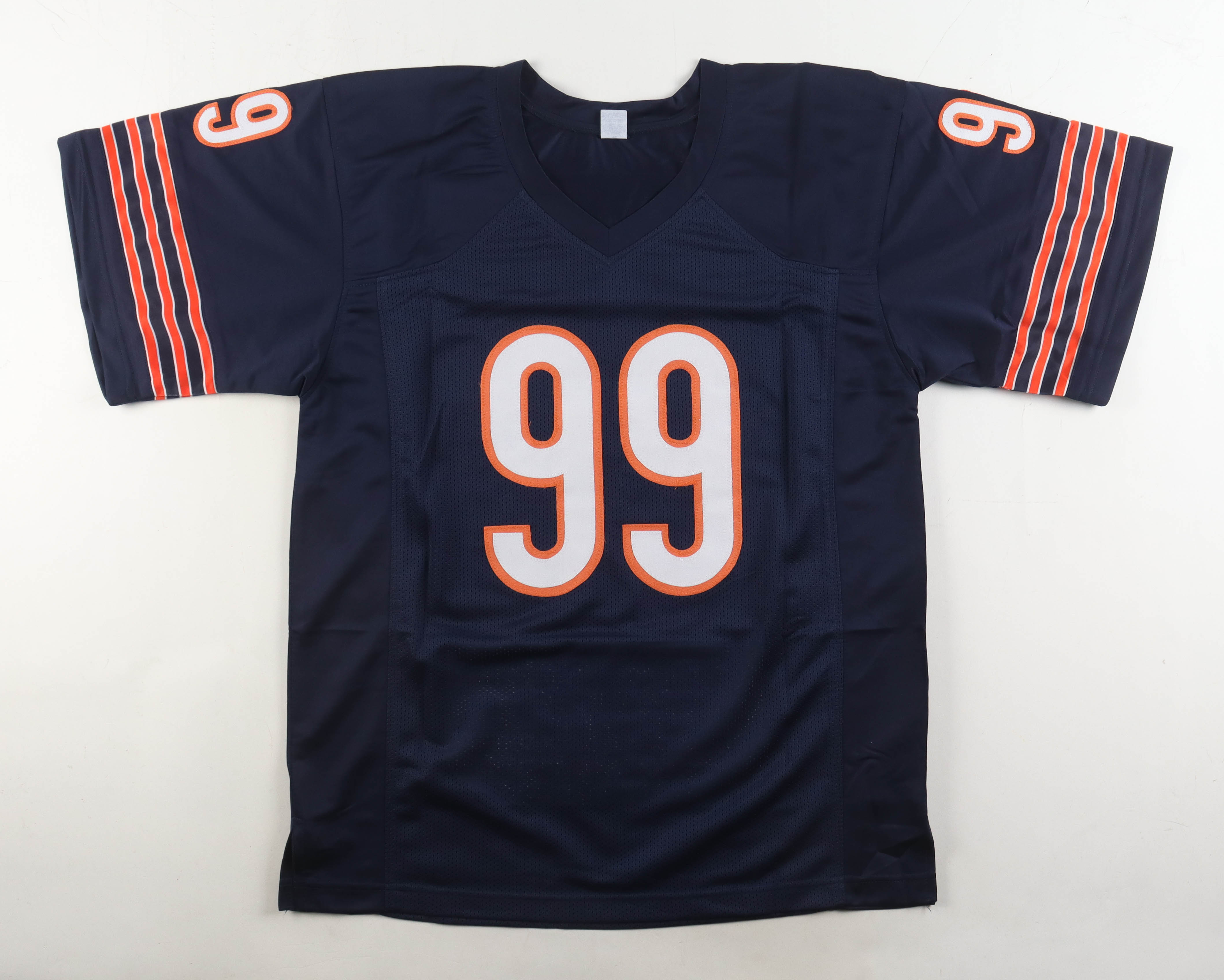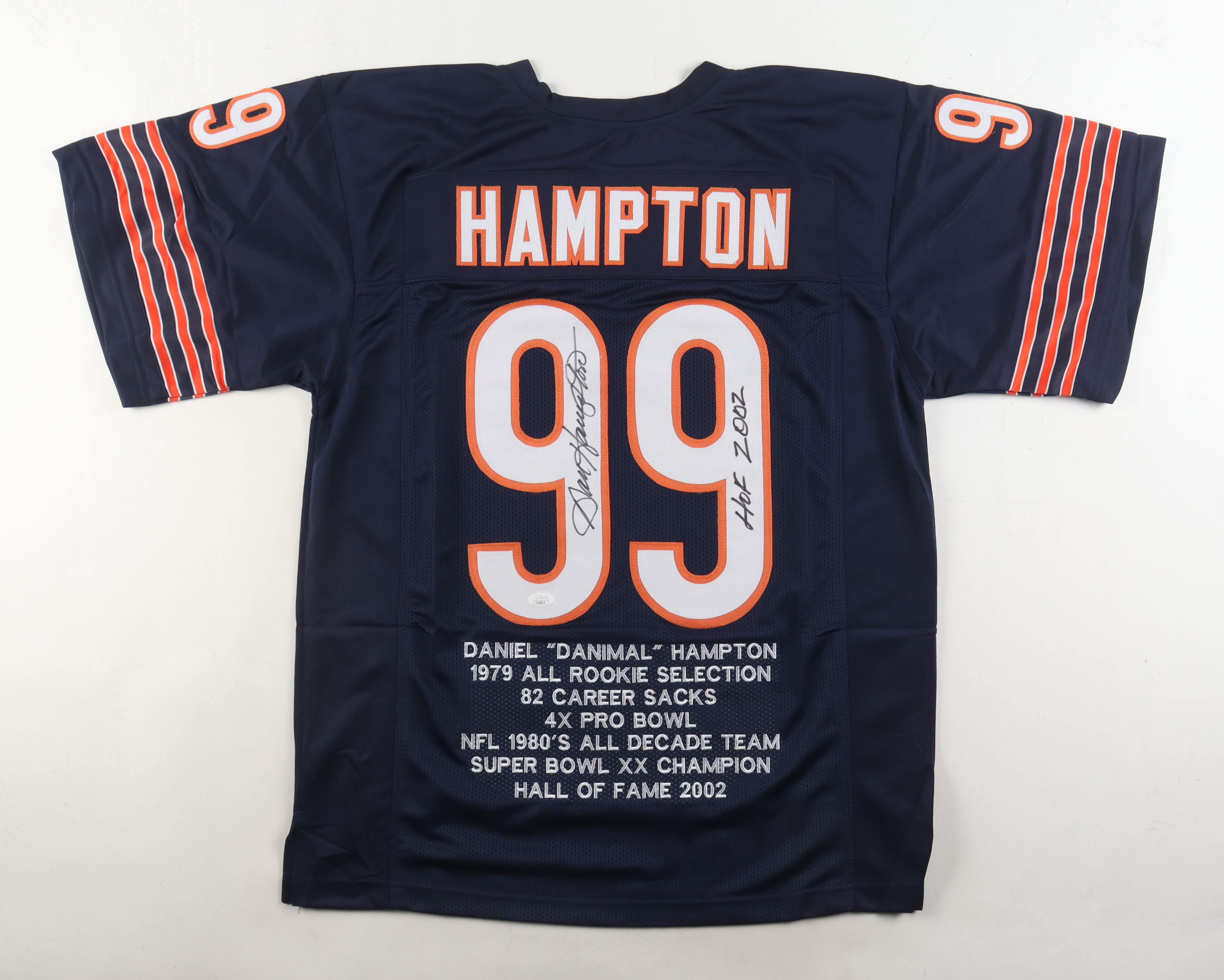 Custom jersey. Everything is sewn on, size XL. Hand-signed and inscribed by Dan Hampton (HOF). Hampton's career highlights have been custom stitched onto the back of the jersey below the reverse numbers.