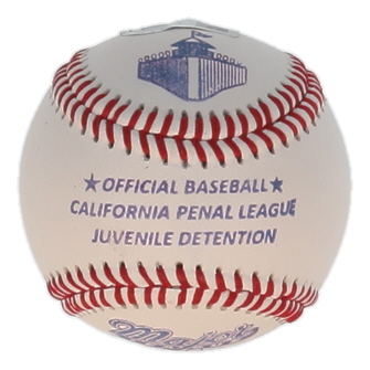 Official California Penal League Baseball. Hand-signed by Charlie Sheen (Ricky 'Wild Thing' Vaughn). Please note, there are stains throughout the baseball.