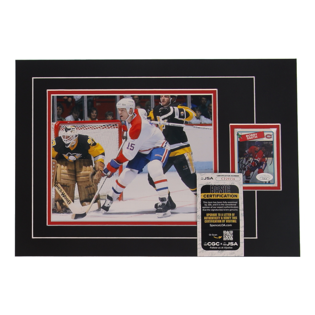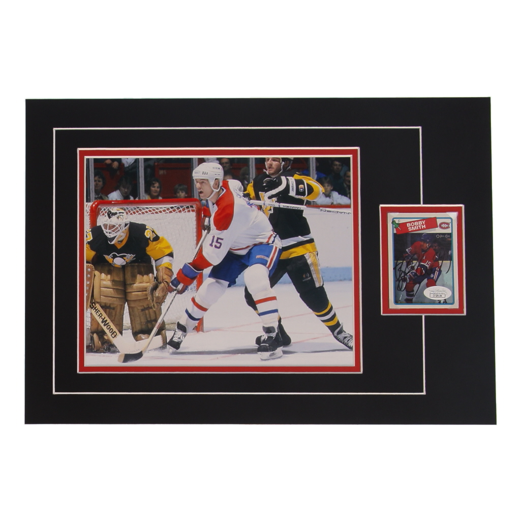 Custom display measures approximately 12" x 17" in size and features a sports card that has been hand-signed by Bobby Smith (Montreal Canadiens). The display also features an 8" x 10" photo.