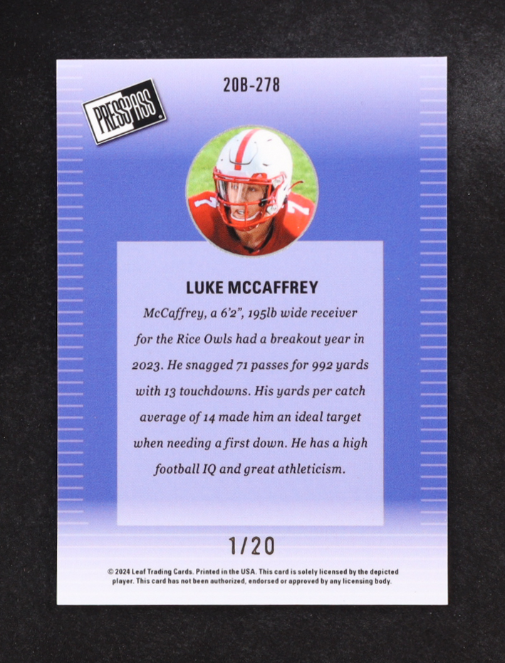 Luke McCaffrey 2024 Leaf Metal Collective Press Pass '00 Base Retail Light Blue Shimmer #20B278 #1/20 RC