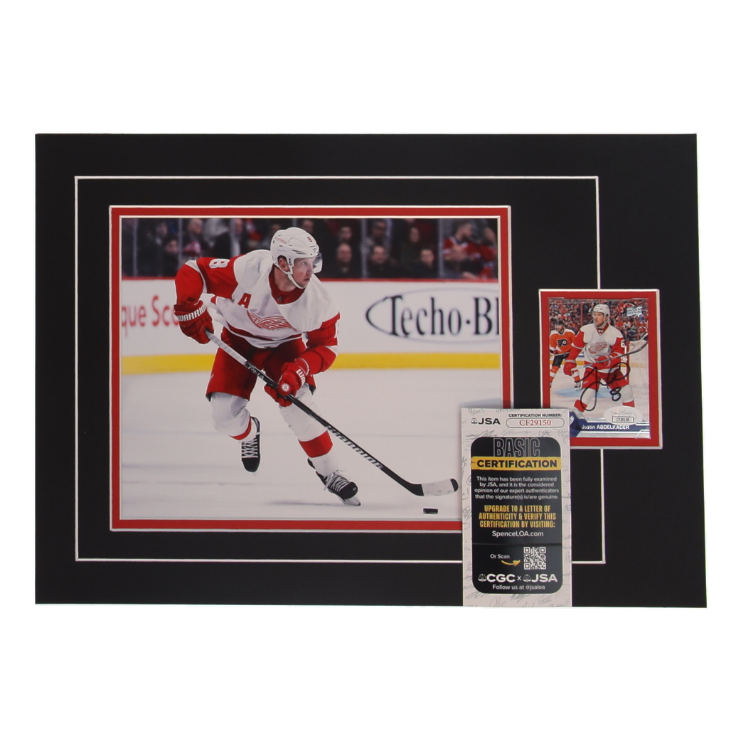 Custom display measures approximately 12" x 17" in size and features a sports card that has been hand-signed by Justin Abdelkader (D.2019, Detroit Red Wings, HOF). The display also features an 8" x 10" photo.