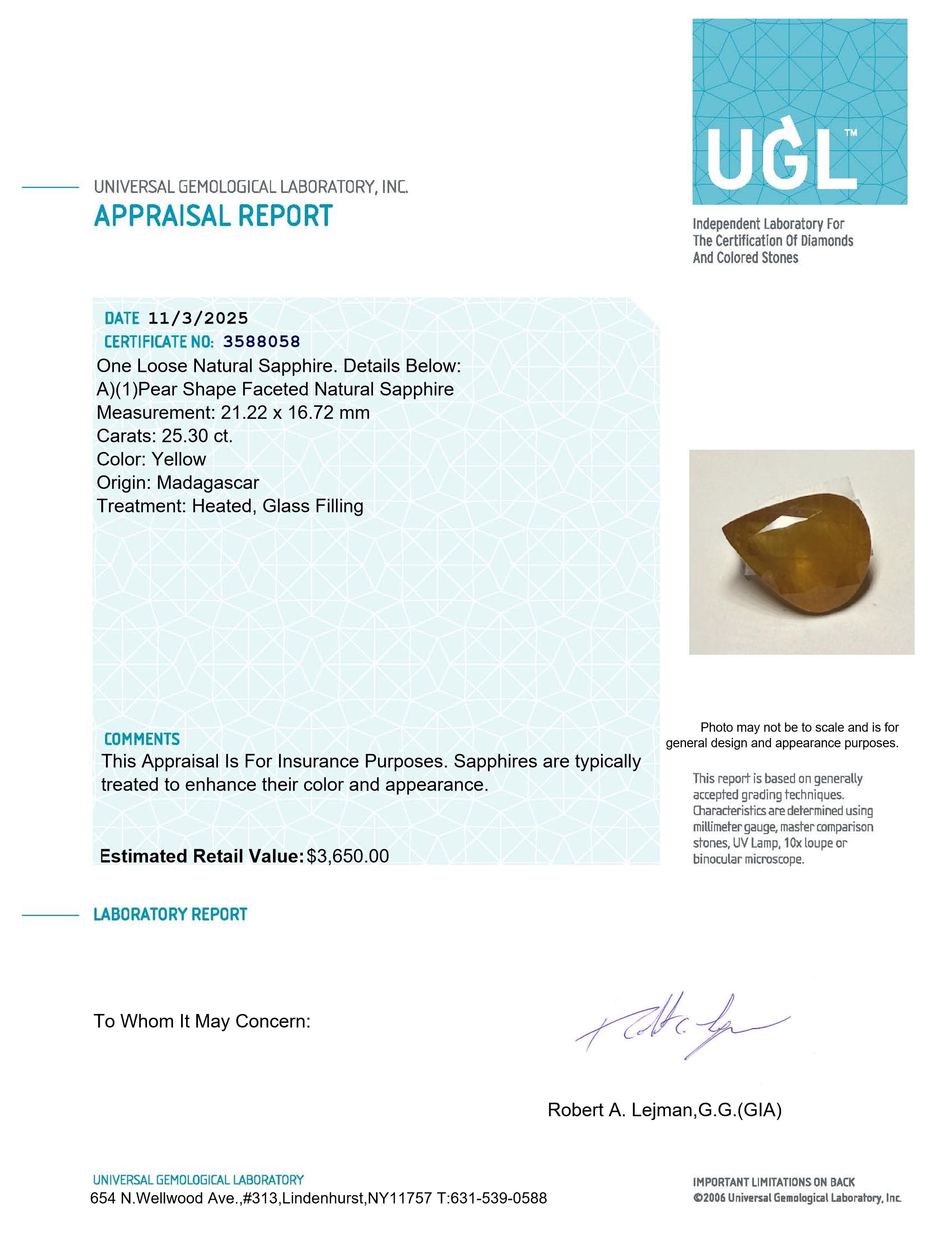 25.30 Carats Yellow Sapphire Loose | Estimated Retail Value $3,650 (UGL & IGI)