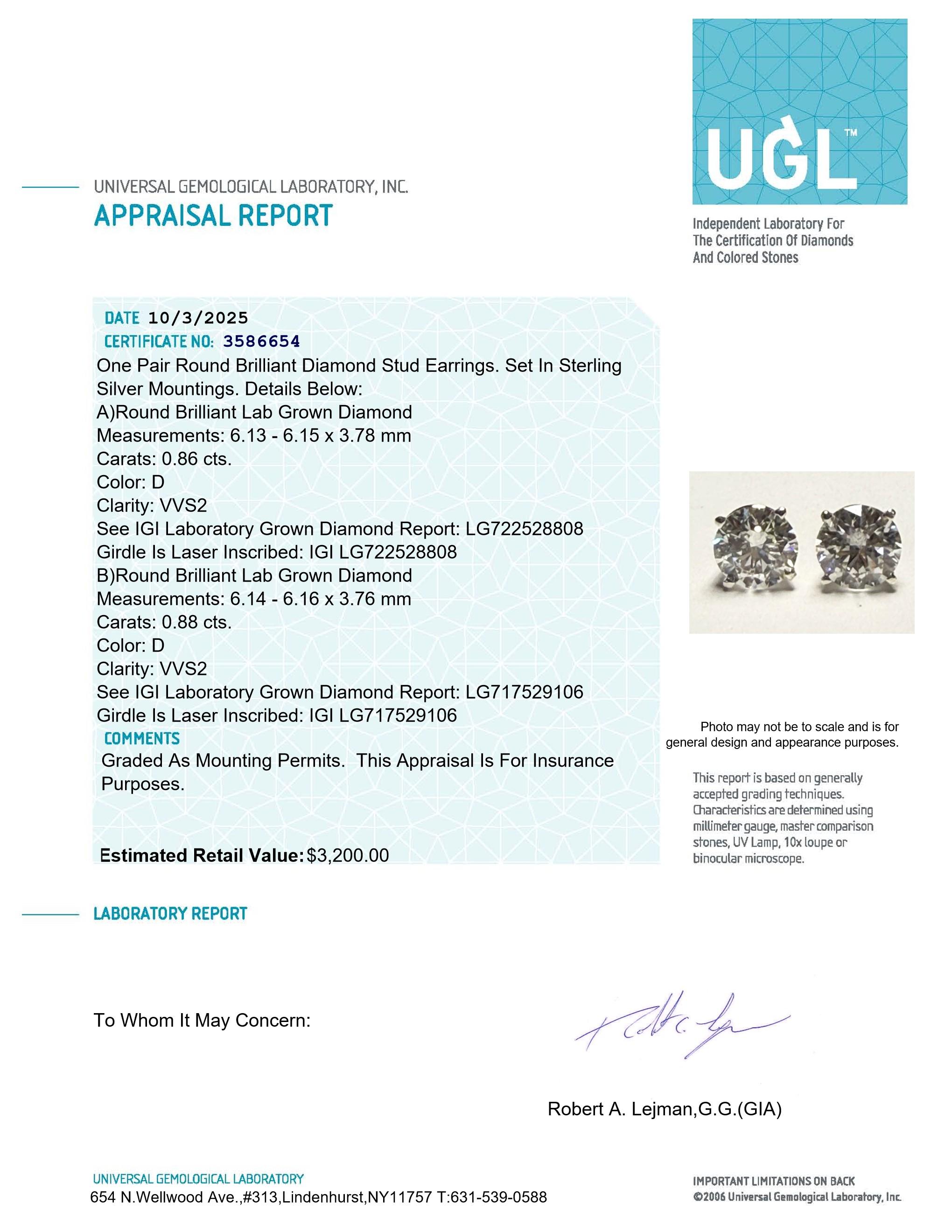New 1.74 CTW Lab Grown Pair of Diamond Earrings D, VVS2 | Hearts & Arrows Ideal Cut | Estimated Retail Value: $3,200 (UGL & IGI)