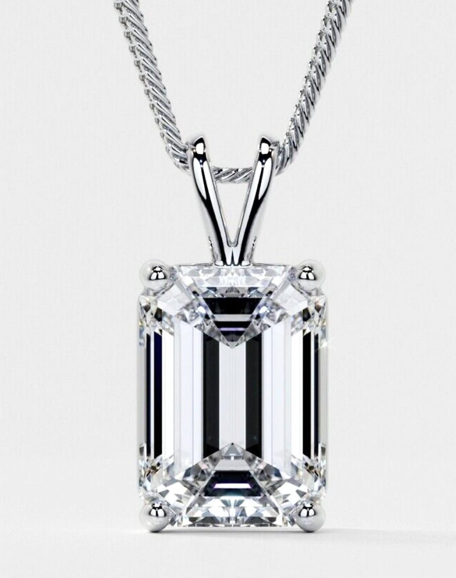One New Emerald Cut Diamond Solitaire Pendant. Mounting is Made of Sterling Silver.