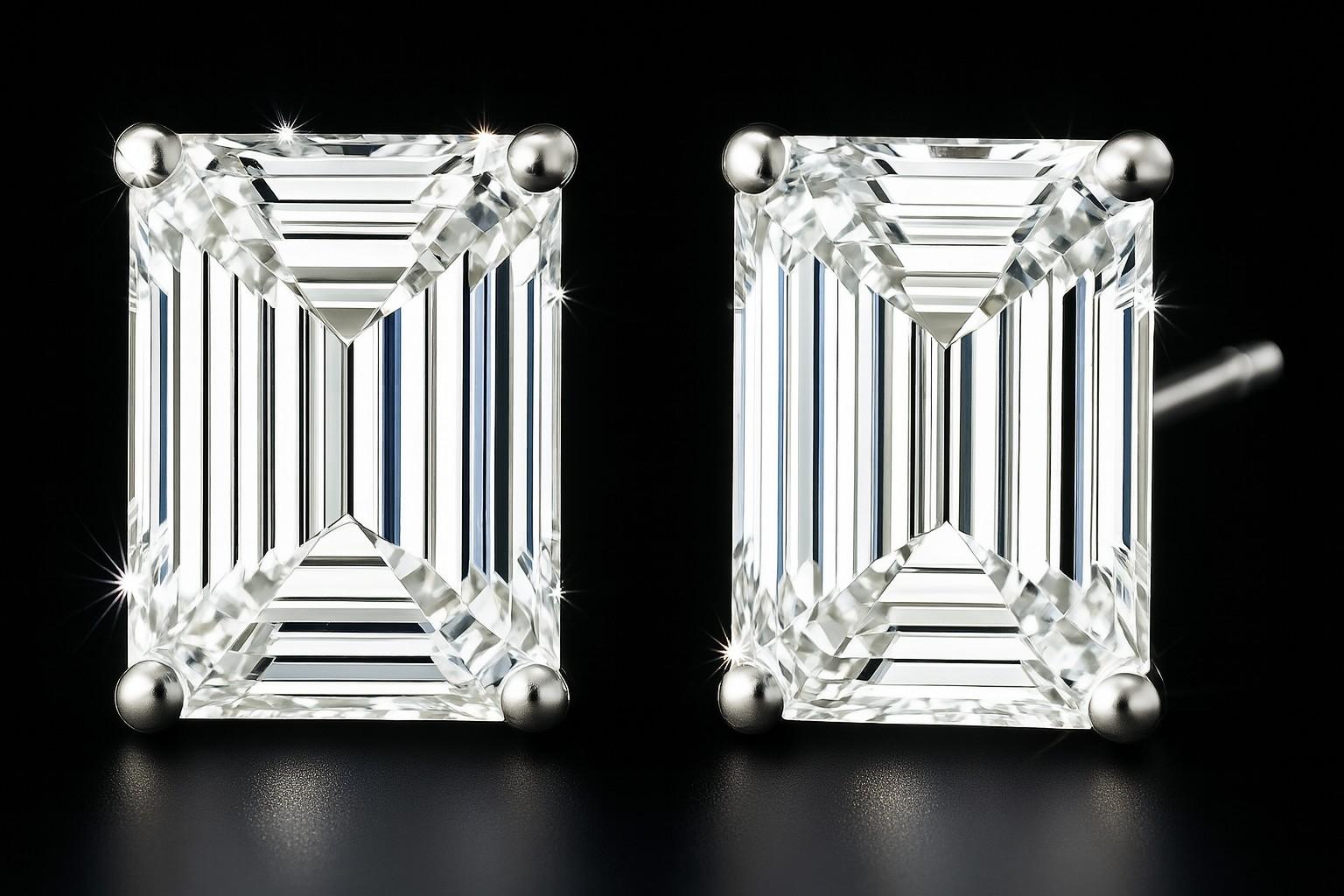 One Pair Emerald Cut Diamond Stud Earrings. Set In Sterling Silver Mountings.